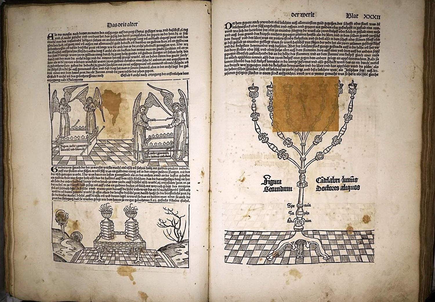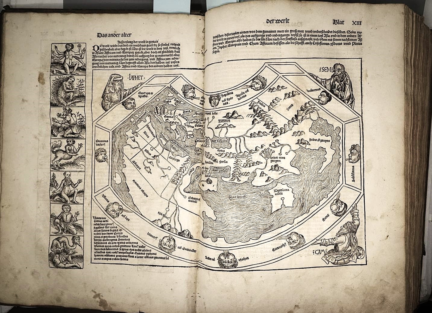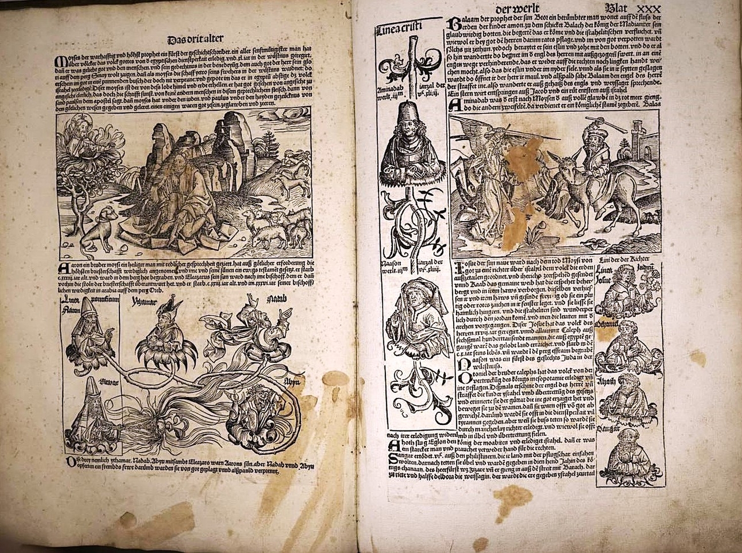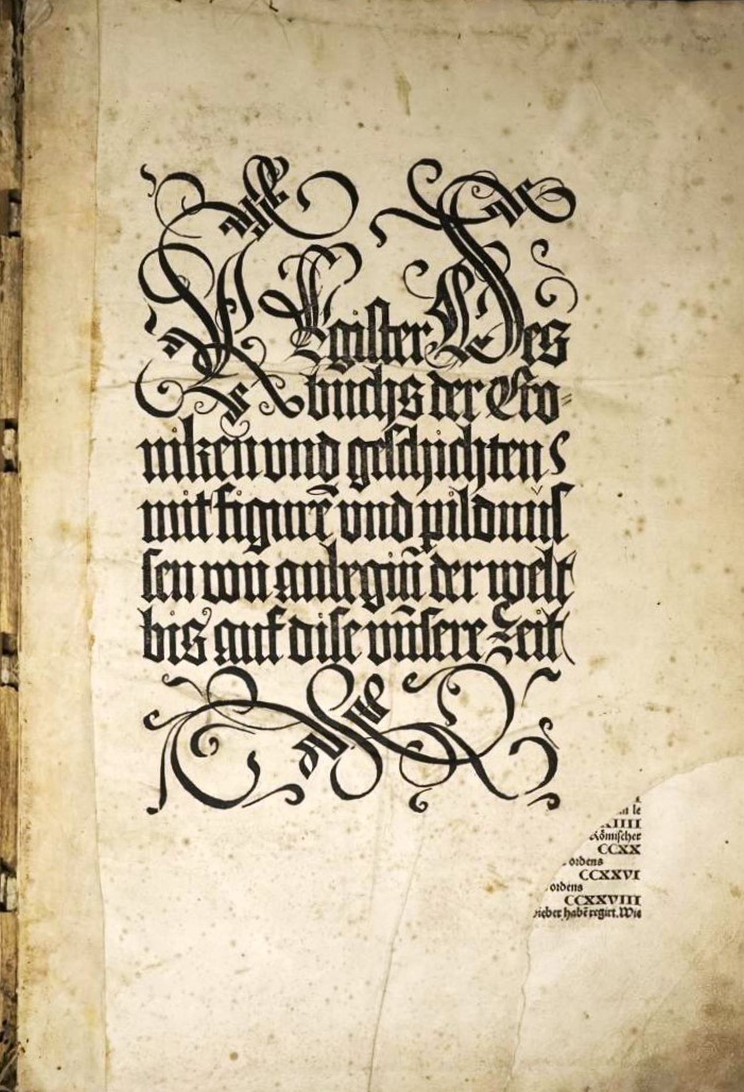 Hain 14510. GW 40796. Goff S-309. Proctor 2086. Pellechet 10354. Klebs 890.1. Schreiber 5205. Schramm XVII, 408-576. Bodleian S-110 Borm 2414. Bornatico 12. Collijn 966. Finger 870. 871. Günther 2071. Hubay 1861. Hummel-Wilhelmi 637. Schäfer 310. Kind 809. 810. Madsen 3637. Schlechter-Ries 1615-1619. Ohly-Sack 2530-2532. Raffel 438. Riedl 904. 905. Sack 3184. Sallander 1337b. Scheidegger-Tammaro 1206. Sheehan S-134. Voullième 1096. Walsh 734. 735. CBB 3471. CIH 3041. IBE 5181. IDL 4062. IGI 8830. BMC II, 437. BSB-Ink S-197 CIBN S-163. ISTC is00309000. – Erste deutsche Ausgabe des "Liber chronicarum", der berühmten Weltchronik des Nürnberger Humanisten, Historikers und Arztes Hartmann Schedel (1440-1514), die ein halbes Jahr nach der lateinischen Originalausgabe erschienen war. Es war das "größte Buchunternehmen der Zeit" (Rücker) und gehört zu den am umfangreichsten illustrierten Inkunabeln überhaupt. Die dafür verpflichteten Künstler Michael Wohlgemuth (1434-1519) und sein Schwiegersohn Wilhelm Pleydenwurff (1460-1494) kamen aus derselben Nürnberger Werkstatt, in der auch Albrecht Dürer ausgebildet worden war.