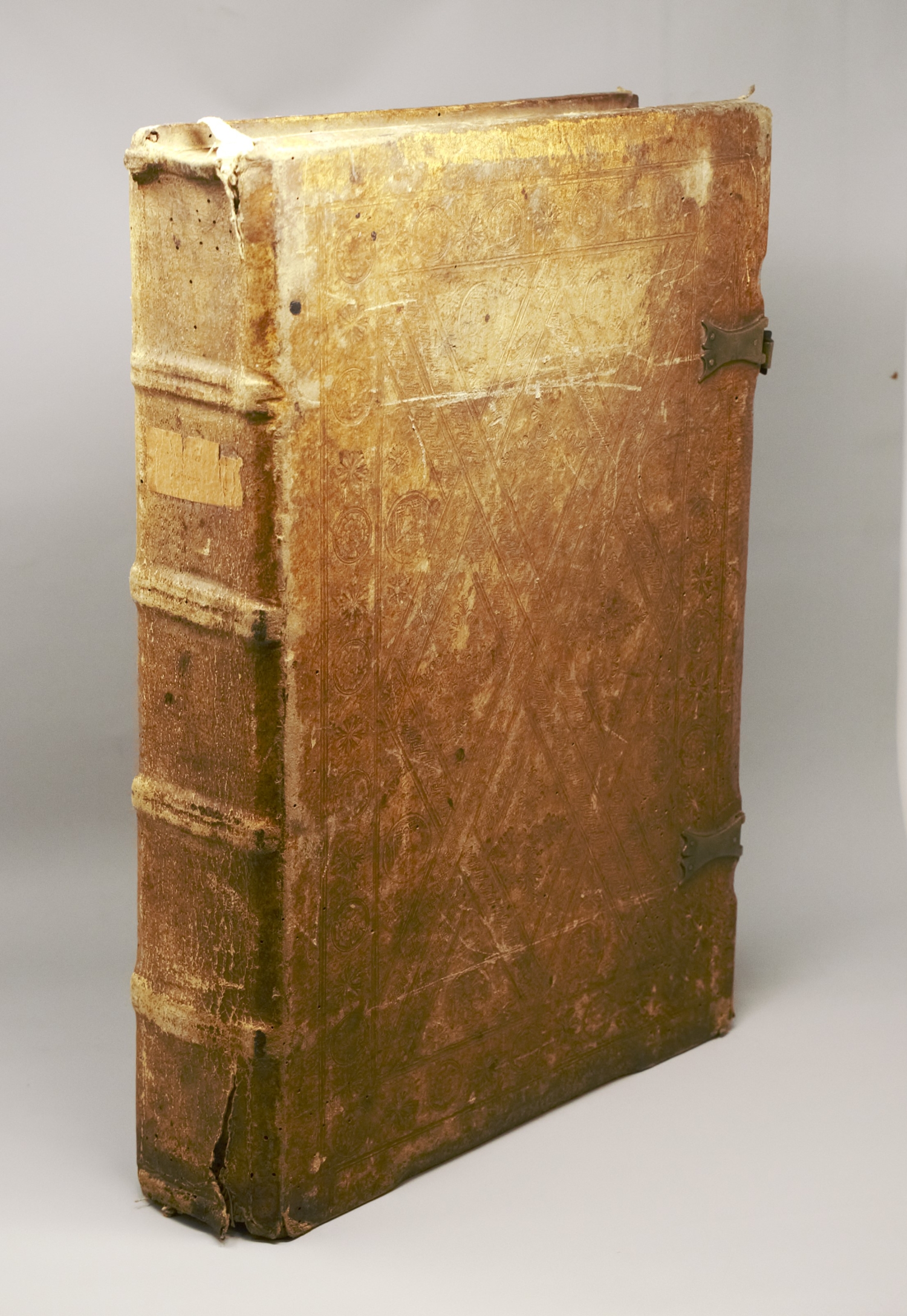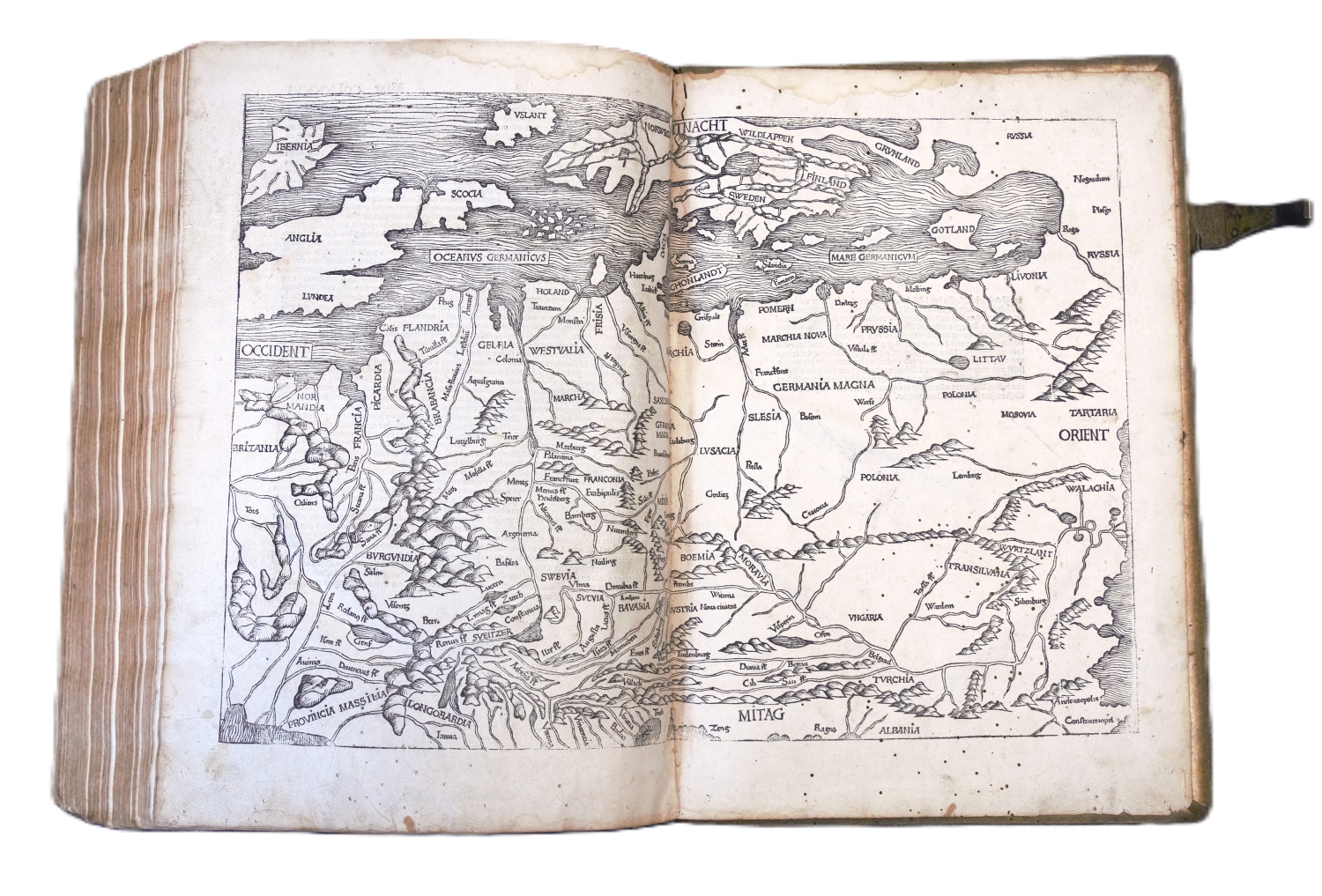 Schedel, Hartmann. Das Buch der Chroniken und Geschichten. Übersetzt von Georg Alt. 297 Bl., gezählt I-CCLXXXVI. 59 Zeilen. Got. Typ. Schriftraum: 32,7 x 22,5 cm. Format: 47,3 x 33 cm. Mit doppelblattgroßer Holzschnitt-Karte und ca. 1808 Holzschnitten (inklusive Wiederholungen) von Michael Wolgemut und Wilhelm Pleydenwurf. Reich blindgeprägter Schweinslederband d. Z. auf schweren, stellenweise abgefasten, kantigen Holzdeckeln mit Rautendekor in breiten Stempelbordüren sowie 2 geschmiedeten Messingschließen an vier Beschlägen (ein Schließbügel fehlend; etwas abgeschabt, berieben, fleckig und vereinzelt wurmstichig, Kanten teils offen, Rücken mit Bezugseinrissen). Nürnberg, Anton Koberger für Sebald Schreyer und Sebastian Kammermaister, 23. XII. 1493.