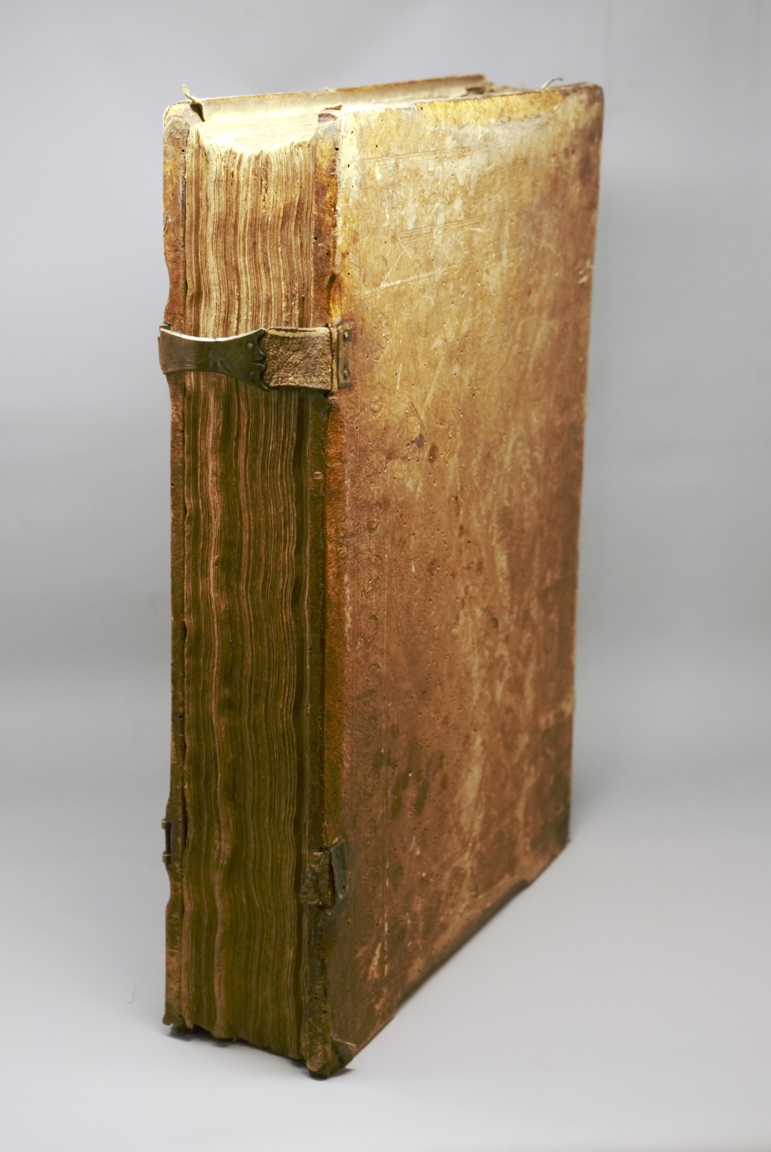 Das Einbanddekor mit Dreifachfileten, die mit Flecht-Zickzackbändern zu einem, von Bordüren umgebenen Rautenmuster zusammengesetzt sind zeigt Stempel, die üblichen wie Sternstempel, Rosenstempel in doppelter Rundlinie (punktiert und gezogen), Akanthus-Blüten-Agraffe, aber auch einen sehr individuellen (leider nicht in der Einbanddatenbank SBK, bei Schunke und Kyriss nachweisbaren) großen Stempel mit der thronenden Maria im großen Tondo, mit Jesusknaben auf einem gotisch durchbrochenem Thron in den Rautenspiegeln (3,5 cm Druchmesser).