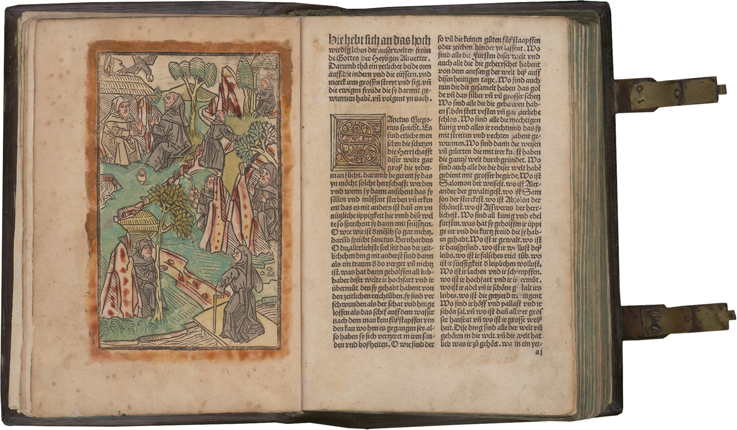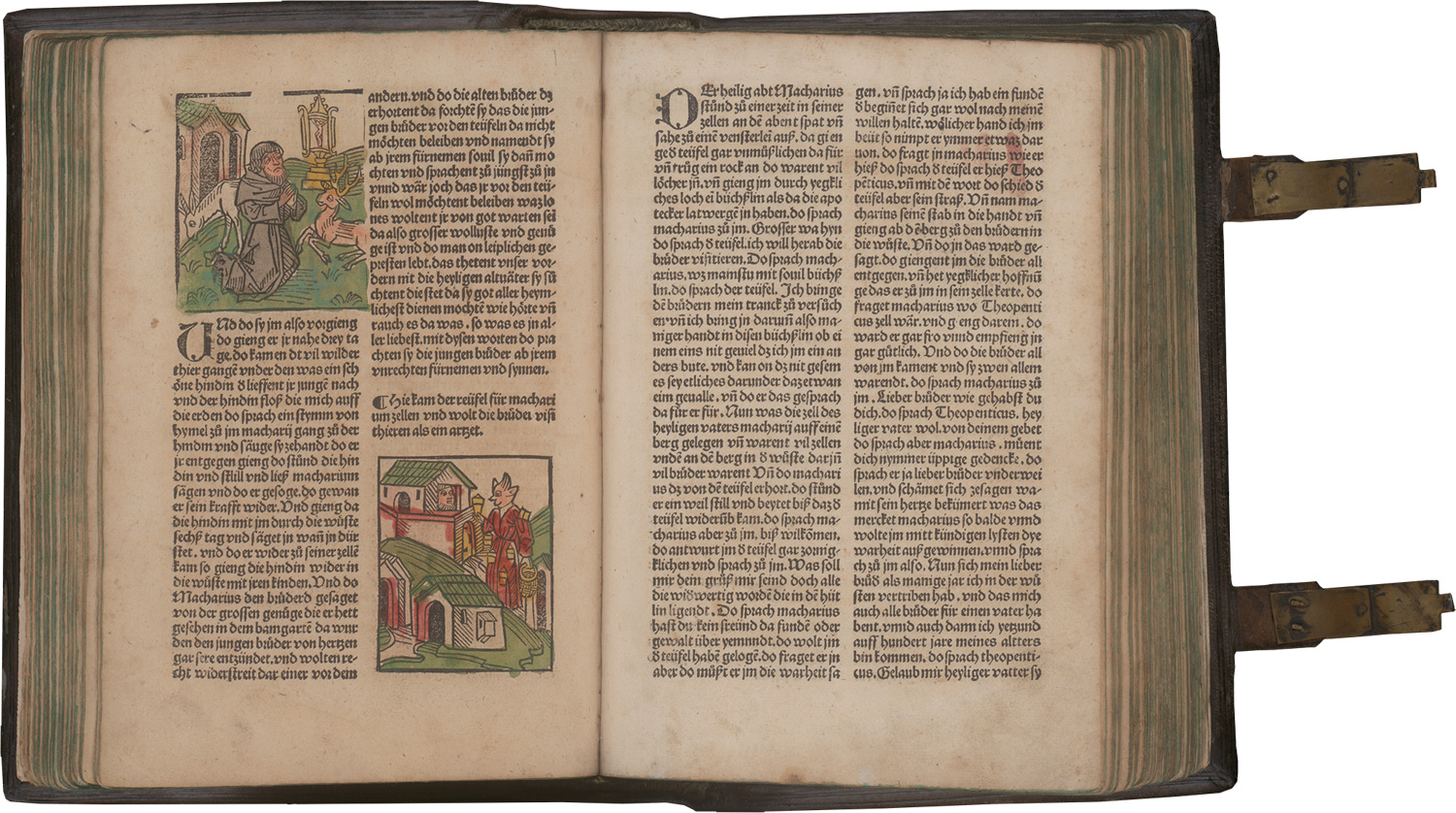 Hieronymus. - Vitas patrum deutsch. Leben der Heiligen Altväter. "Das hochwirdig leben der außerwölten freünde gotes der heiligen altväter was wunder zaichen die gewirckt haben [...]". 283 (statt 284, ohne das le. w., das 142. w. r8 vorhanden). 2 Spalten. 39 Zeilen. Got. Typ. Schriftraum: 20,3 x 13,6 cm. Format: 28,8 x 18 cm. Mit 264 (1 ganzseitigem Titel-) kolorierten Textholzschnitten vom Kreuzfahrt- bzw. dem Columna-Meister. Braunschwarzes festes Kalbsleder im Stil d. Z. über schweren abgefasten Holzdeckeln mit vielfachen Blindfileten, Rundstempeln und 2 jeweils 3-teiligen Messingschließen, dreiseitiger dunkelgrüner Schnitt. In modernem grünen Leinenschuber mit goldgeprägtem Titel. Augsburg, Johann Schönsperger d. Ä., 9.VI.1497.