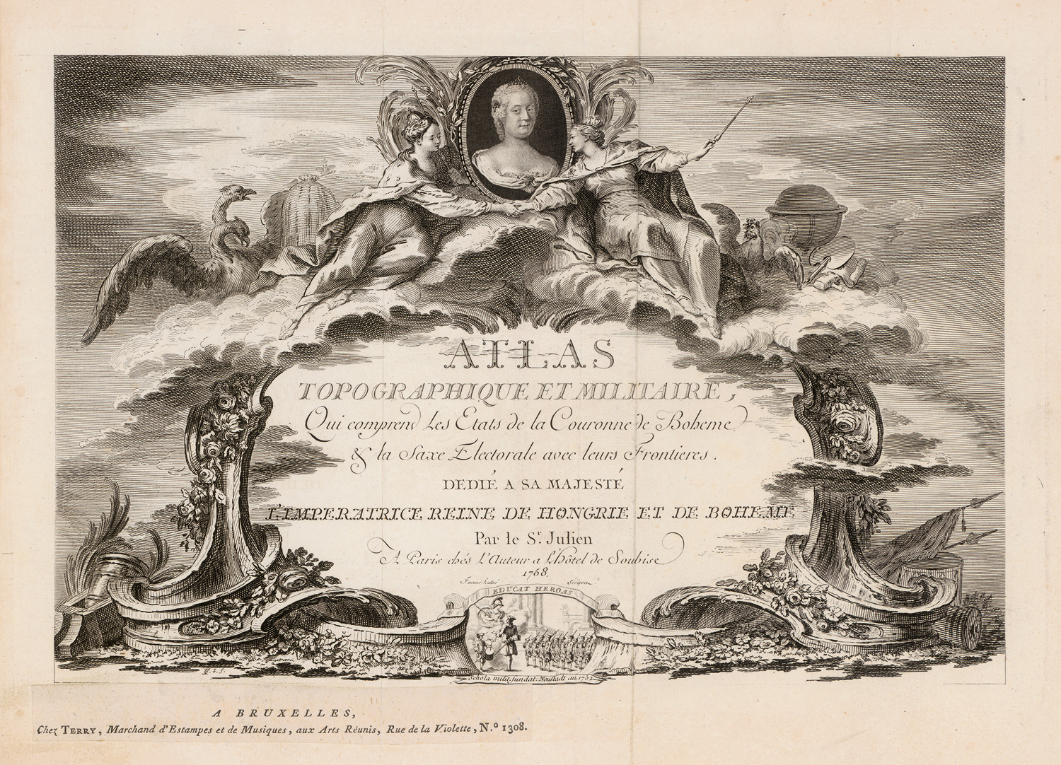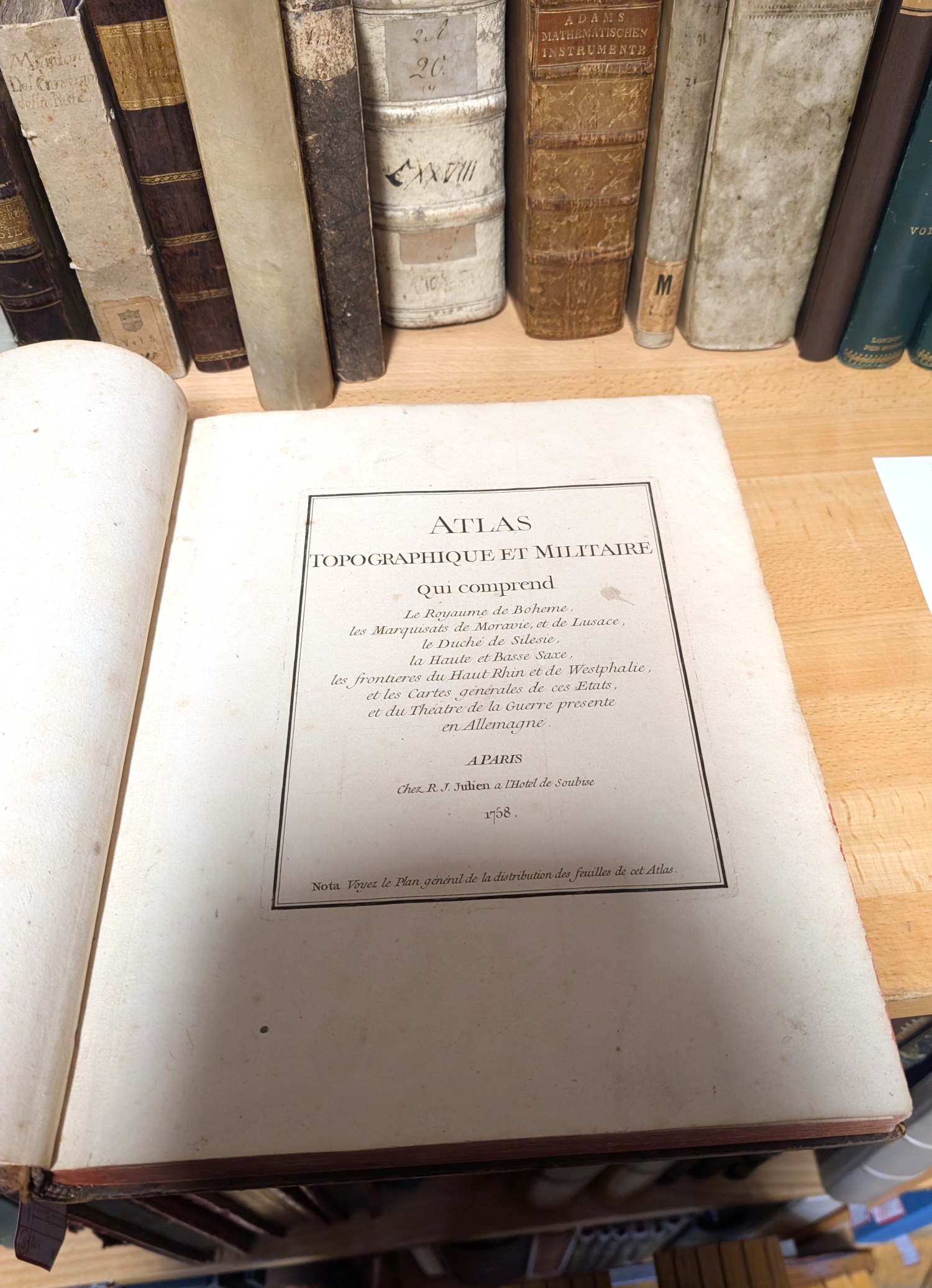 Phillips I, 3029. – Erste Ausgabe. Atlas zu den Schauplätzen der Schlesischen Kriege. Enthält eine Übersichtskarte, eine Legende, einen Plan Berlins und 63 Gebietskarten von Böhmen, Mähren, Schlesien, Sachsen, Thüringen, Brandenburg und Niedersachsen." Roch-Joseph Julien war als Verleger und Kartographen in Paris von ca. 1750 bis 1780 tätig. – Der Plan lose beiliegend (mit 2 kleinen Falzrissen). Der doppelblattgroße Titel unten mit zusätzlicher Verkäuferadresse von Terry in Brüssel auf Tekturstreifen. Kaum fleckig, wenige Tafeln gebräunt, ansonsten schön erhalten.