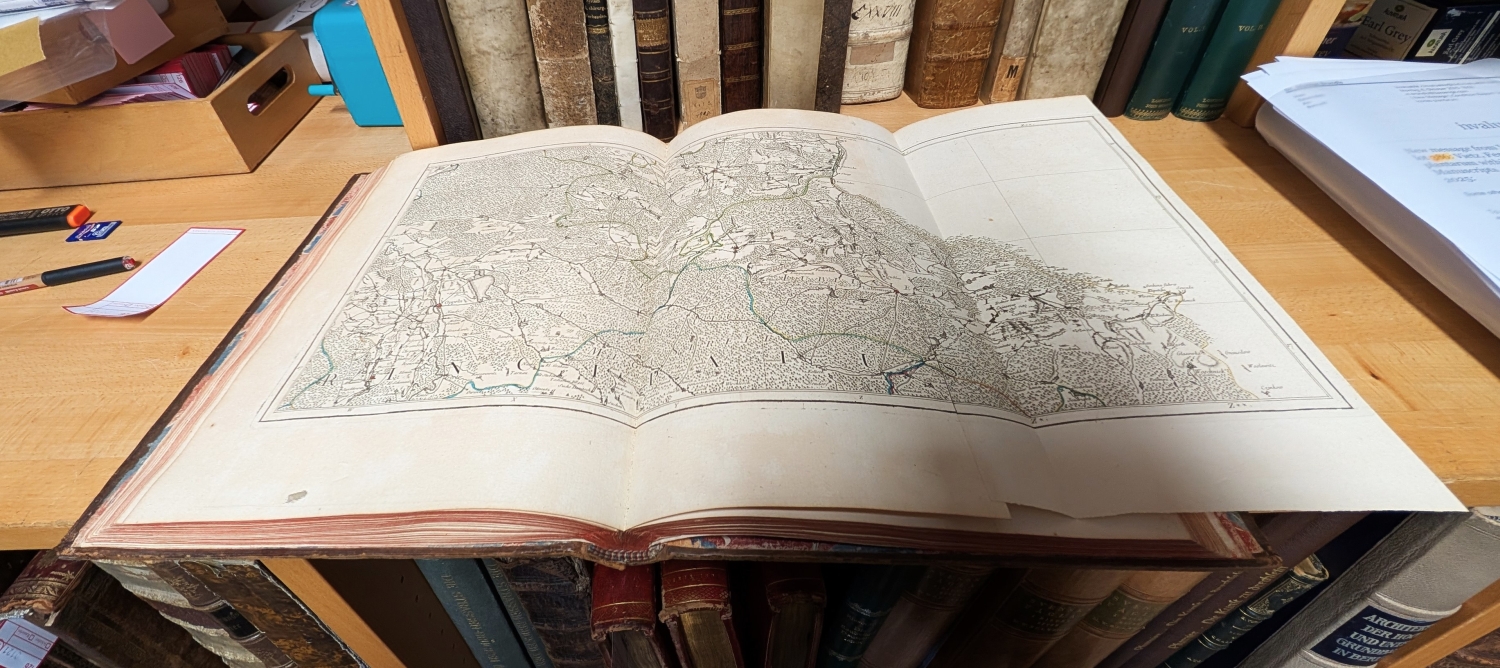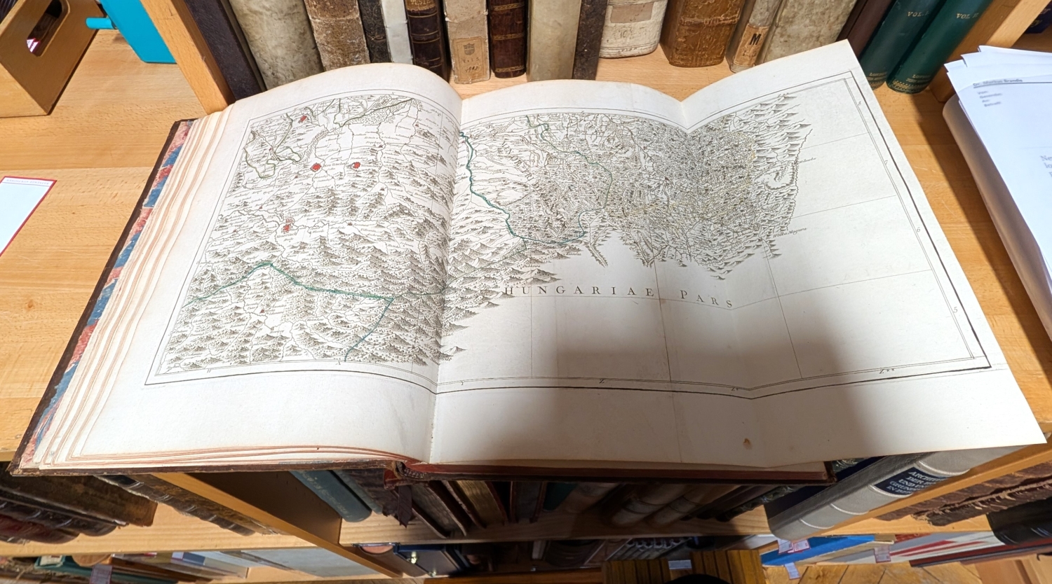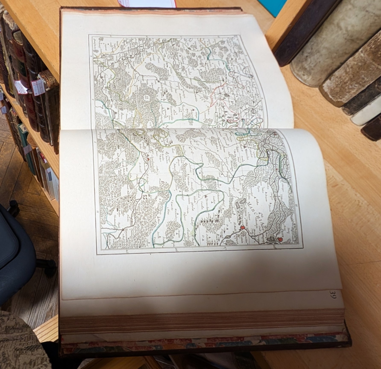Julien, R(och-)J(oseph). Atlas topographique et militaire qui comprend le royaume de Bohême, les marquisats de Moravie et de Lusace, le duché de Silésie, la haute et basse Saxe, les frontières du haut Rhin et de Westphalie, et les cartes générales de ces états et du théatre de la guerre présenté en Allemagne. 2 (1 doppelblattgroß) Kupfertitel, gestochene Übersichtskarte, gestochene Legende mit 63 (60 grenz-, 2 teilkolorierten) teils gefalteten Kupferkarten und 1 mehrfach gefalteter Plan. 33 x 25,5 cm. Wurzelmarmoriertes Leder d. Z. (bestoßen, Deckel mit kleineren Fehlstellen) mit goldgeprägtem RSchild und floraler RVergoldung. Paris, Selbstverlag, 1758.