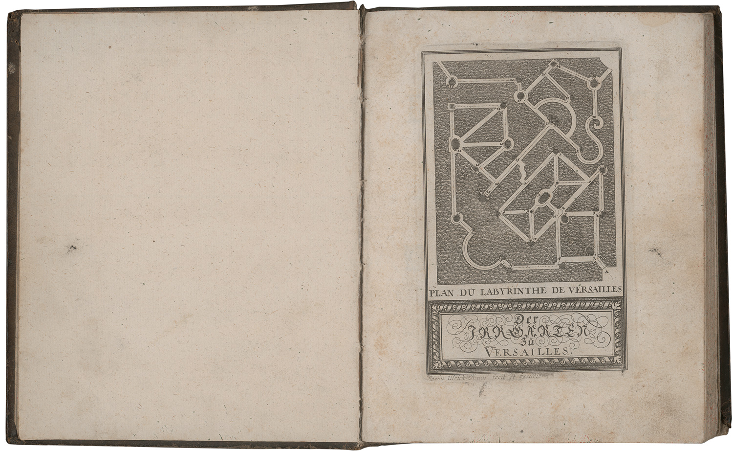 VD17 12:644437V. Graesse IV, 48. Fabula docet No. 81. Nicht bei Thieme-Becker und im Ornamenstichkatalog Berlin. – Seltene deutsch-französische Ausgabe, der französische Erstdruck erschien 1677 in der Imprimerie Royale in Paris. Exemplar mit der vollständigen Kupferfolge sowie dem kompletten Text (Titel, Vorrede, Beschreibung des Irrgartens, Erklärung des Grundrisses, Text der Fabeln auf Französisch und Deutsch). Die heute nicht mehr erhaltenen prächtigen Springbrunnen aus dem Labyrinth von Versailles wurden auf Anregung Charles Perraults (1628-1703) von Sebastian Le Clerc (1637-1714) in Kupfer gestochen, Perrault verfasste dazu die erläuternden Texte und Isaac de Benserade (1612-1691) die metrischen Vierzeiler mit Sinnsprüchen nach Jean de la Fontaine und den Fabeln Äsops. "Charles Perrault konzipierte seine Labyrinth-Beschreibung als 'Führer' durch eine sehenswerte Gartenarchitektur, weniger als Verherrlichung der königlichen Pracht am Hof des Sonnenkönigs. Sein Buch, das auch die Fabelepigramme Benserades enthielt, hatte er mit Kupferstichen von Sebastien Le Clerc illustrieren lassen. Johann Ulrich Kraus, der sich auch in anderen Werken gerne am stilistischen Vorbild Le Clercs orientierte, stach die Illustrationen des Franzosen in Seitenverkehrung sehr genau nach und ließ den Text Perraults von Andreas Müller für den "Ergoetzlichkeit-Liebenden Leser" übersetzen" (Fabula docet). Das seinerzeit berühmte und reich ausgeschmückte Labyrinth entstand zwischen den Jahren 1672 und 1681 im Petit Parc des Schlosses und erstreckte sich auf eine Fläche von mehr als einem Hektar. Alle errichteten 39 Springbrunnen waren farbig bemalt, die aus Bleiguss gefertigten Tiere symbolisierten Themen aus den Fabeln des Äsop. Im Unterschied zu anderen Labyrinthen des Barock bestand das Ziel darin, den Weg hindurch so zu wählen, dass alle Brunnen einmal besucht und bestaunt wurden. Im Rahmen einer Neugestaltung der Parkanlage wurde das Labyrinth 1774 entfernt. – Etwas finger- oder stockfleckig, am Schluss mit kleinerem Feuchtigkeitsfleck in der oberen rechten Ecke. Titel mit breit überklebtem zeitgenössischem Besitzeintrag sowie der ergänzten Jahreszahl "1715". Lose beiligend ein Blatt mit hs. Großem Einmaleins in Pyramidenform.