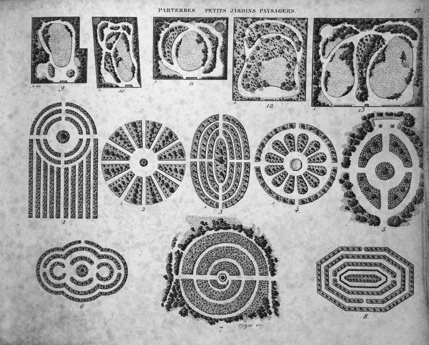 (Schoubin, J.). Traité de la composition et de l'ornament des jardins. Cinquième édition. XI, 225 S. Mit 161 Kupfertafeln. 17 x 22 cm. Etwas späterer Halbleinenband (berieben) mit RTitel. Paris, Audot, 1839.