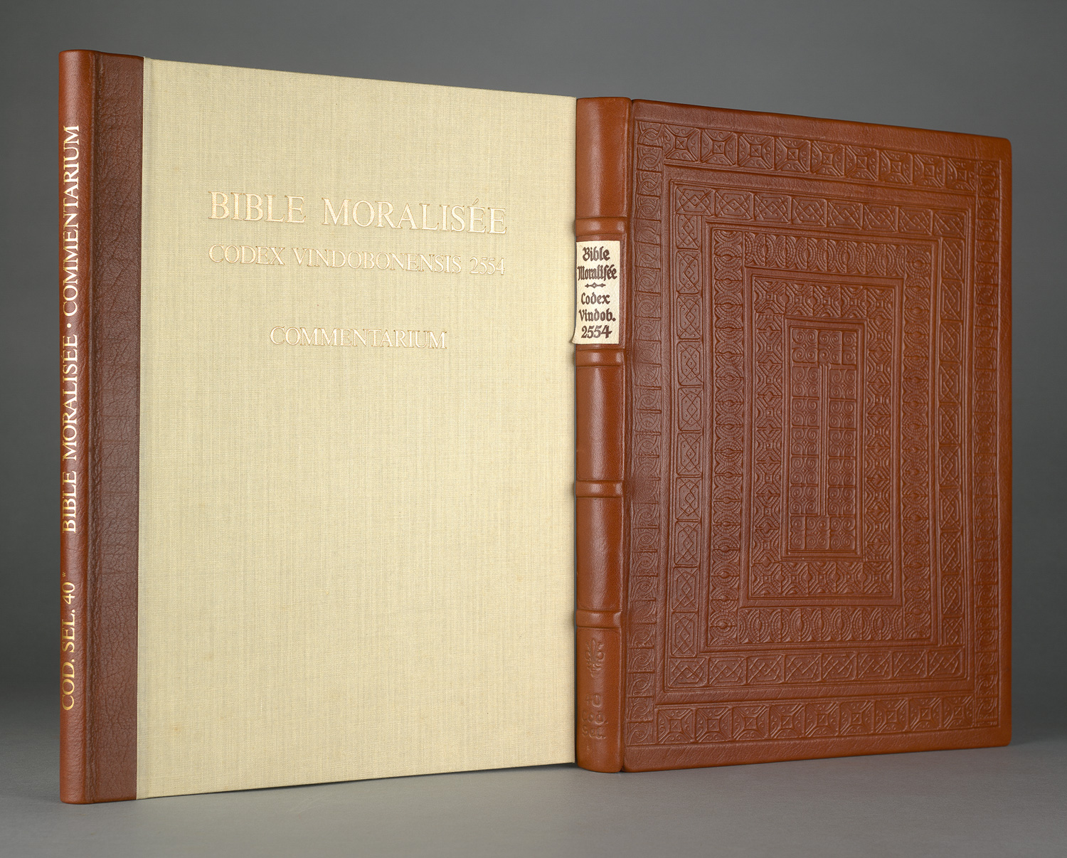 Bible moralisée. Faksimile-Ausgabe des Codex Vindobonensis 2552 der Österreichischen Nationalbibliothek. Text- und Tafelband. 35,5 x 27 cm. Blindgeprägter OLederband und OHalbleder mit goldgeprägtem RTitel in OPappschuber mit goldgeprägtem RSchild. Graz, Akademische Druck- u. Verlagsanstalt, 1973.