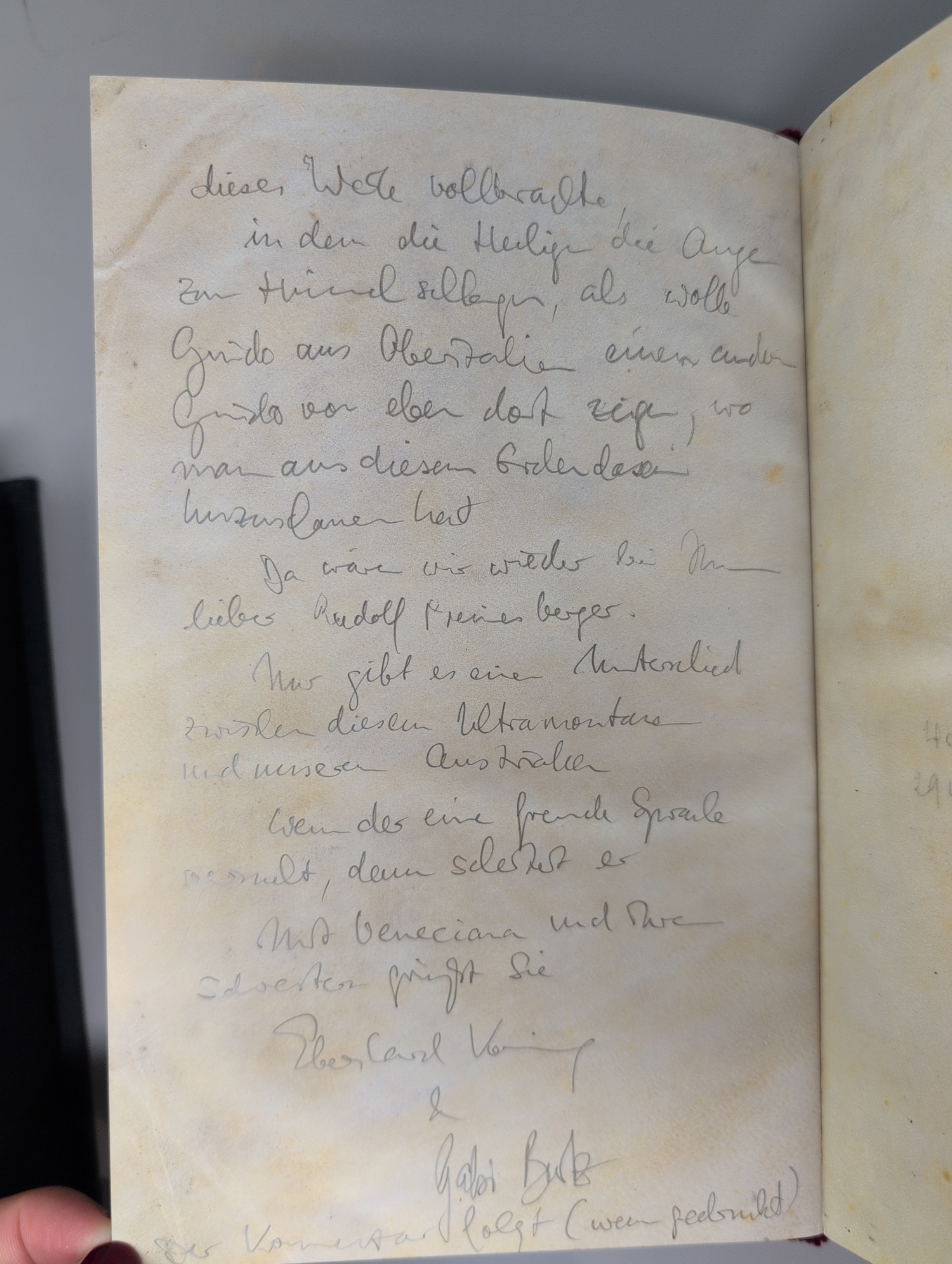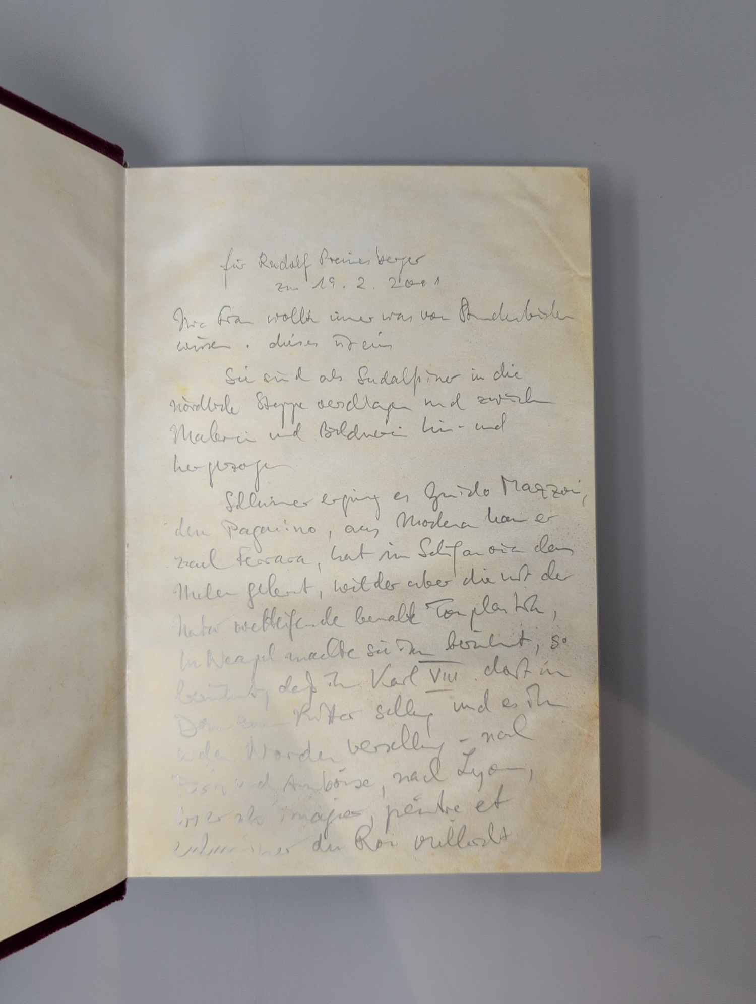 Eines von 730 Exemplaren (Gesamtauflage 1000). - Das Stundenbuch gilt als das wichtigste Werk des Meisters Antoine de Roche und ist mit 334 Miniaturen reich ausgestattet. Die lateinische Handschrift entstand um 1500, vermutlich in Paris oder Lyon. – Vorsatzblatt, recto und verso beschrieben, mit einer 40-zeiligen Bleistiftwidmung des Kunsthistorikers Eberhard König an seinen Fachkollegen Rudolf Preimesberger. Sehr guter Zustand.