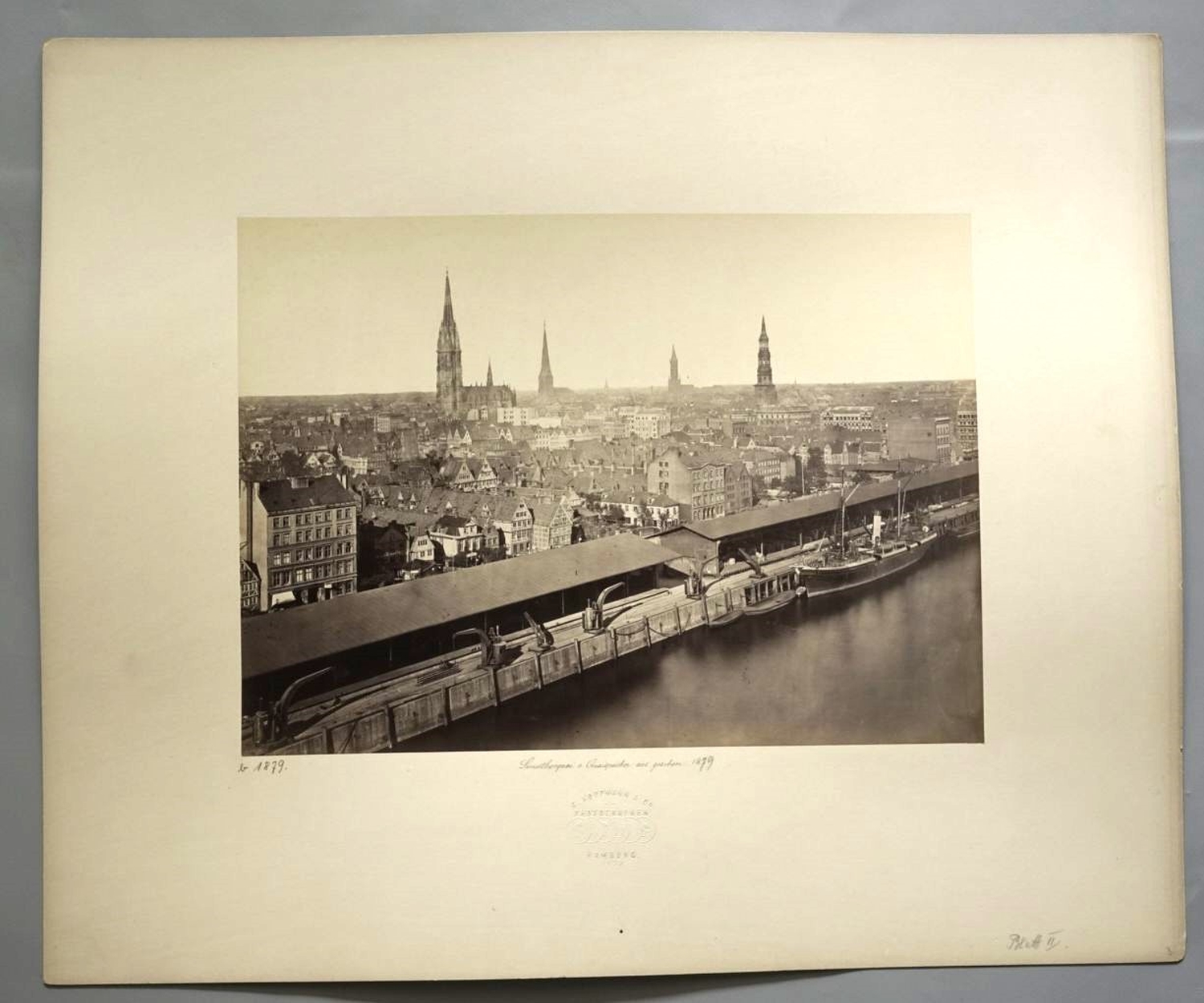 Heidtmann 17389. – Die Tafeln zeigen zahlreiche Straßen und Plätze Hamburgs, wie zum Beispiel: "Hohebrücke", "Brook von Osten aus gesehen", "Kleines Fleth vom Sandthorquai aus gesehen", "Englische Kirche am Johannisbollwerk II", "Mührenfleth östlich vom Wasserbaum bei Spenshörn", "Am Stadtdeich I.", "Am Stadtdeich II.", "Ansicht der Rathswaage", "Kehrwieder von der Hellenenbrücke aus gesehen", "Niederbaumbrücke", "Rathhausmarkt", "Kehrwieder No. 74" etc. – Teils leicht gewellt und Karton mit Einrissen, Fehlstellen und teils kleinen Gebrauchsspuren. Fotografien vereinzelt leicht verblasst, sonst gut erhalten.