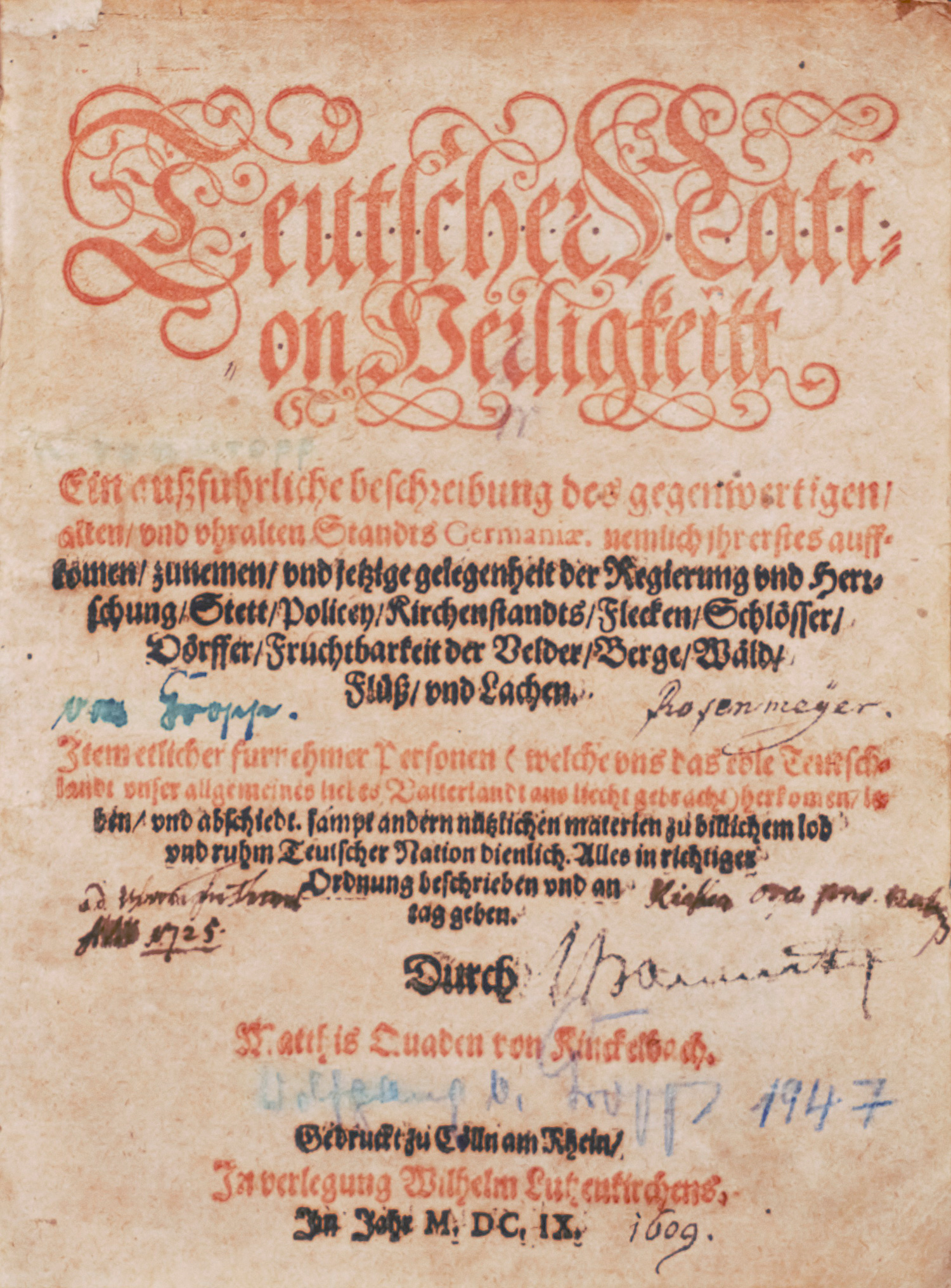 Quad, Matthias. Teutscher Nation Heiligkeitt. Ein außfuhrliche beschreibung des gegenwertigen, alten, und uhralten Standts Germaniae. nemlich ihr erstes auffkomen, zunemen, und jetzige gelegenheit der Regierung und Herrschung, Stett, Policey, Kirchenstandts, Flecken, Schlösser, Dörffer, Fruchtbarkeit der Velder, Berge, Wäld, Flüß, und Lachen. Item etlicher furnehmer Personen (welche uns das edle Teutschlandt unser allgemeines liebes Vatterlandt ans liecht gebracht) herkomen, leben, und abschiedt. 4 Bl., 460 (recte: 450) S., 2 Bl. Titel in Rot und Schwarz. 19,5 x 14,5 cm. Pergament d. Z. (fleckig und berieben, Vorderdeckel mit 2 hs. Besitzeinträgen). Köln, Wilhelm Lützenkirchen, 1609.