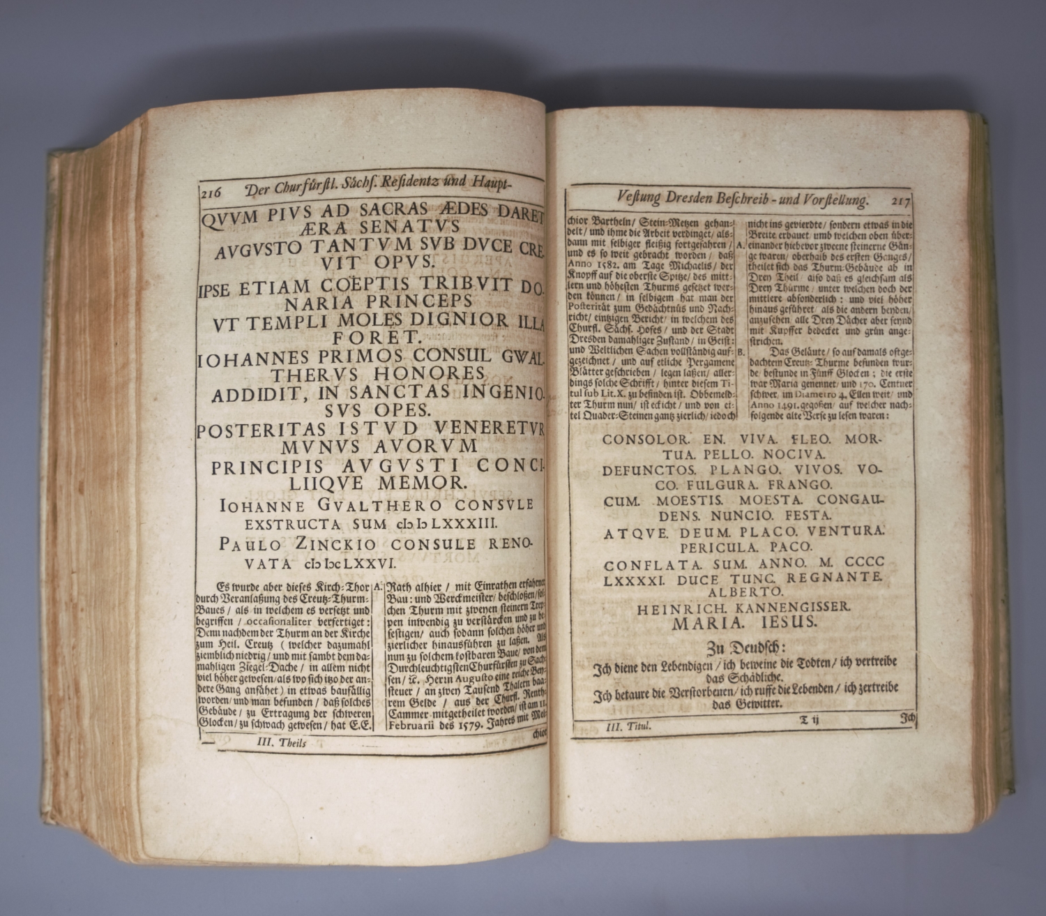 VD17 23:231921V. Ornamentstichkatalog 2079. Grasse VI/2, 427. ADB XLI, 371. – Zweiter Druck dieser prachtvollen barocken Stadtbeschreibung mit schönen Ansichten, darunter auch zwei von je drei Platten gedruckten Gesamtansichten. Die erste Ausgabe war ein Jahr zuvor ebenda erschienen. "Der stattliche Band enthält wesentlich mehr als der Titel verheißt. Neben eingehenden topographischen Angaben finden sich werthvolle Mittheilungen aus der Geschichte des sächsischen Fürsten mit besonderer Hervorhebung der Familienfestlichkeiten; auch die Culturgeschichte ist reichlich vertreten" (ADB). Die Kupfer zeigen u. a. mehrere prachtvolle Gesamtansichten, Gebäude, Pläne und Siegel. Der Kupfertitel stammt von Johann Alexander Boener (1647-1720). Sechs der letzten Blätter enthalten monatsweise tabellarisch angeordnet "Dresdnischer Geschicht-Calender". Die Paginierung springt von S. 242 auf S. 245 und von S. 248 zurück auf S. 247. – Ohne das fast immer fehlende Blatt "Verzeichnis aller derjenigen Kupfer" und das Portrait von Johann Georg II., Herzog zu Sachsen. Papierbedingt teils gebräunt, mit mehreren hinterlegten Fehlstellen, einzelne Blätter teils auf Papier aufgezogen, mit starken Randläsuren, stock- und fingerfleckig, teils mit größeren Wurmgängen (kleiner Textverlust). Mit Exlibris auf dem Vorsatz "Freiherrlich v. Schönberg'sche Schloss Bibliothek Thammenhain". Verso dem Titel mit zwei Besitzstempel "Städtische Bücherei Wurzen" und "Deutsche Staats-Bibliothek Berlin". Der zweite Stempel befindet sich ebenfalls auf dem ersten Blatt mit dem Vermerk "ausgeschieden".