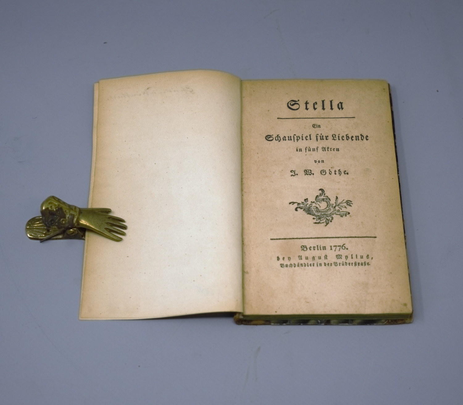 Goethe, J(ohann) W(olfgang von). Stella. Ein Schauspiel für Liebende in fünf Akten. 2 Bl., 115 S. 16 x 9,5 cm. Etwas späterer Halblederband (Kanten beschabt, VDeckel lose) mit RVergoldung und goldgeprägtem RSchild. Berlin, August Mylius, 1776.