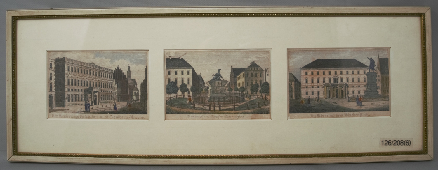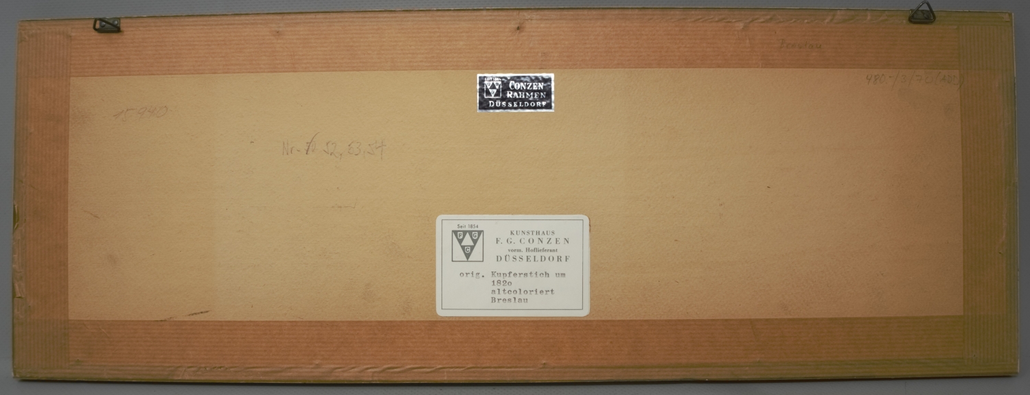 Vorhanden sind: I. Matthäus Merian. Virtute duce, comite Fortuna. 1625. - II. Uratislavia. Breßlau. Mit lateinischer und deutscher Legende. Um 1800. - III. Das Regierungs Gebäude u. d. St. Adalberts-Kirche. Denkmal des Grafen Tauentzien. Die Börse auf dem Blücher-Platz. Kolorierter Kupferstich. Um 1800. -IV. J. B. Hössel. Der Dom u. die Kreutz Kirche von der Ziegel Bastion zu Breslau. Um 1824. - V. Derselbe. Das Universitäts Gebäude zu Breslau. Um 1824. - VI. Derselbe. Der Parade Platz zu Breslau. Um 1824. – Mit kleinen Gebrauchsspuren, insgesamt gute Exemplare. Nicht ausgerahmt.