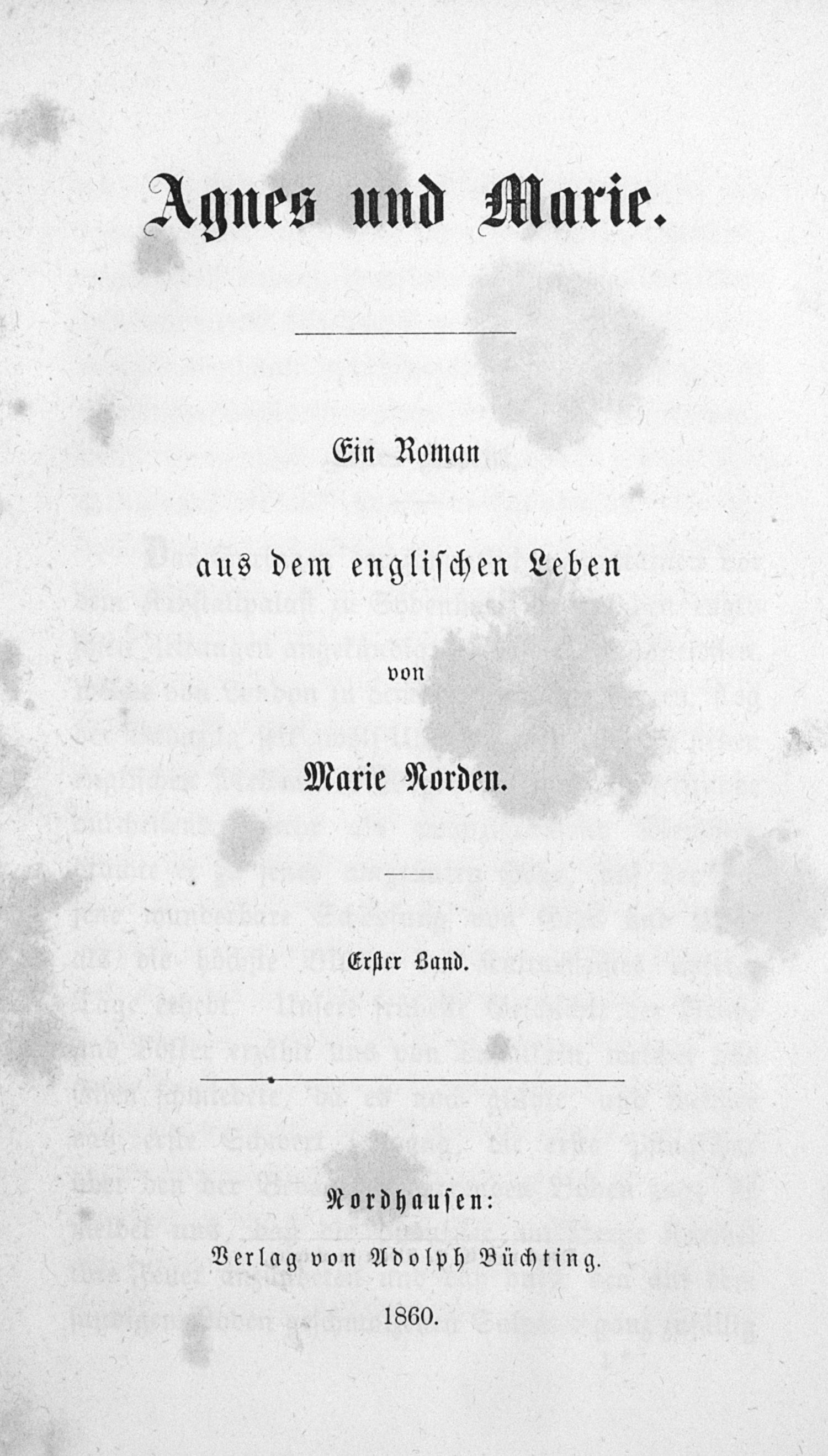 Norden, Marie (d. i. Friederike Wolfhagen). Agnes und Marie. Ein Roman aus dem englischen Leben. 3 Teile in 1 Band. 17,5 x 11,5 cm. Leinen d. Z. (Rücken ausgeblichen) mit dezenter RVergoldung und goldgeprägtem RTitel. Nordhausen, Adolph Büchting, 1860.
