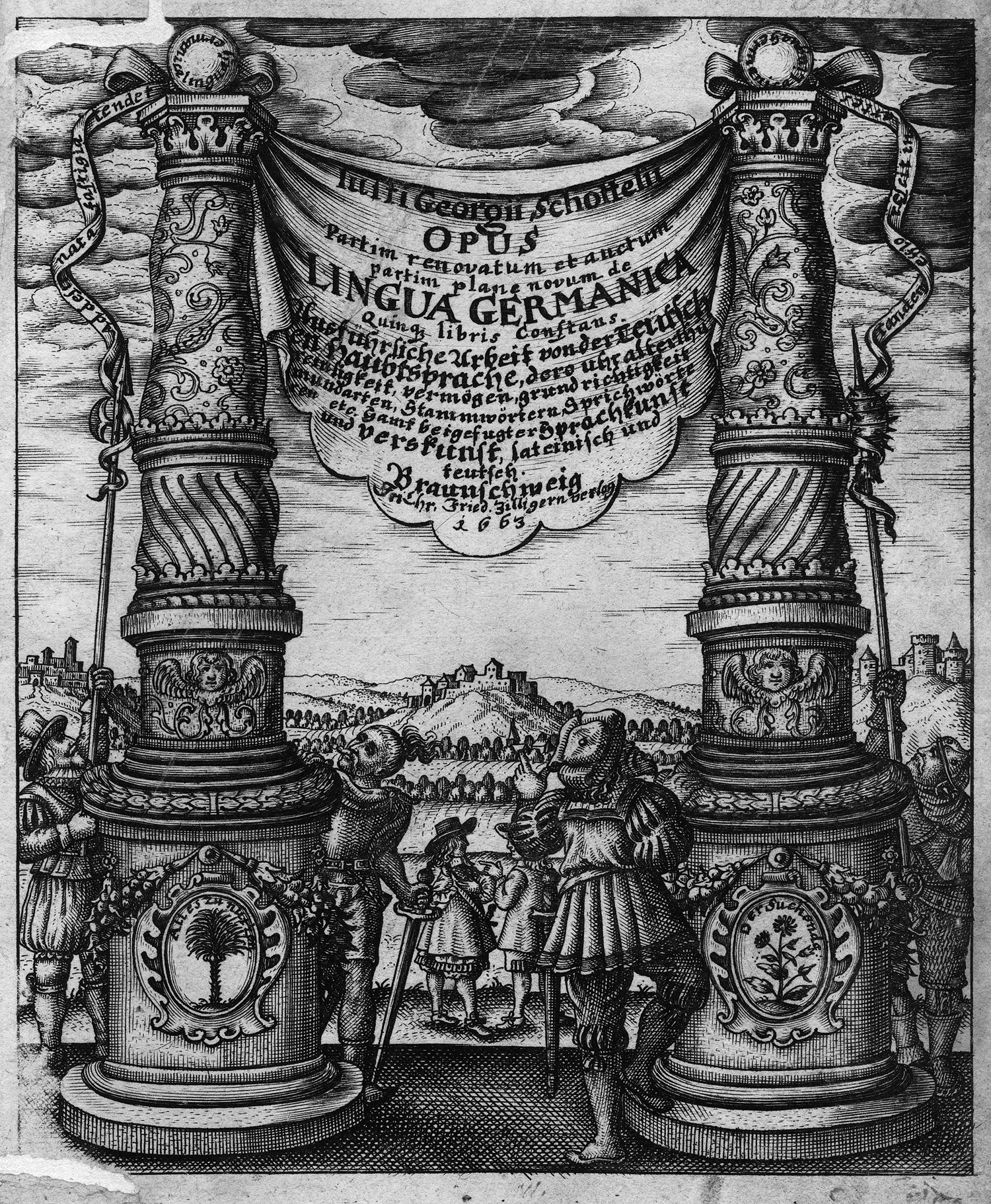 VD17 12:130315E. Dünnhaupt 37.1. Goedeke III, 118, 10. Faber du Faur 697. Jantz 2265. Bulling 57. HAB A 490. Katalog Manheimer 378. – Erste Ausgabe des wichtigsten Sprachwerks vor Jacob Grimm. Diese Arbeit, die in der Vielfalt der Themen wie in der Gründlichkeit, Sorgfalt und Einfühlsamkeit ihrer Behandlung einen einsamen Höhepunkt der deutschen Sprach- und Literaturwissenschaft des 17. Jahrhunderts darstellt, "makes him (Schottelius) if not the father, then the grandfather of germanic philology" (Faber du Faur). "Heiße Liebe zum Gegenstand im Verein mit Gelehrsamkeit und kritischem Sinn haben hier eines der wissenschaftlichsten Werke des 17. Jahrhunderts geschaffen" (Wolfskehl im Katalog Manheimer). Nirgends sind die grammatischen Lehren und sprachtheoretischen Gedanken der Epoche zwischen Ickelsamer und Leibniz umfassender dargestellt worden als hier.