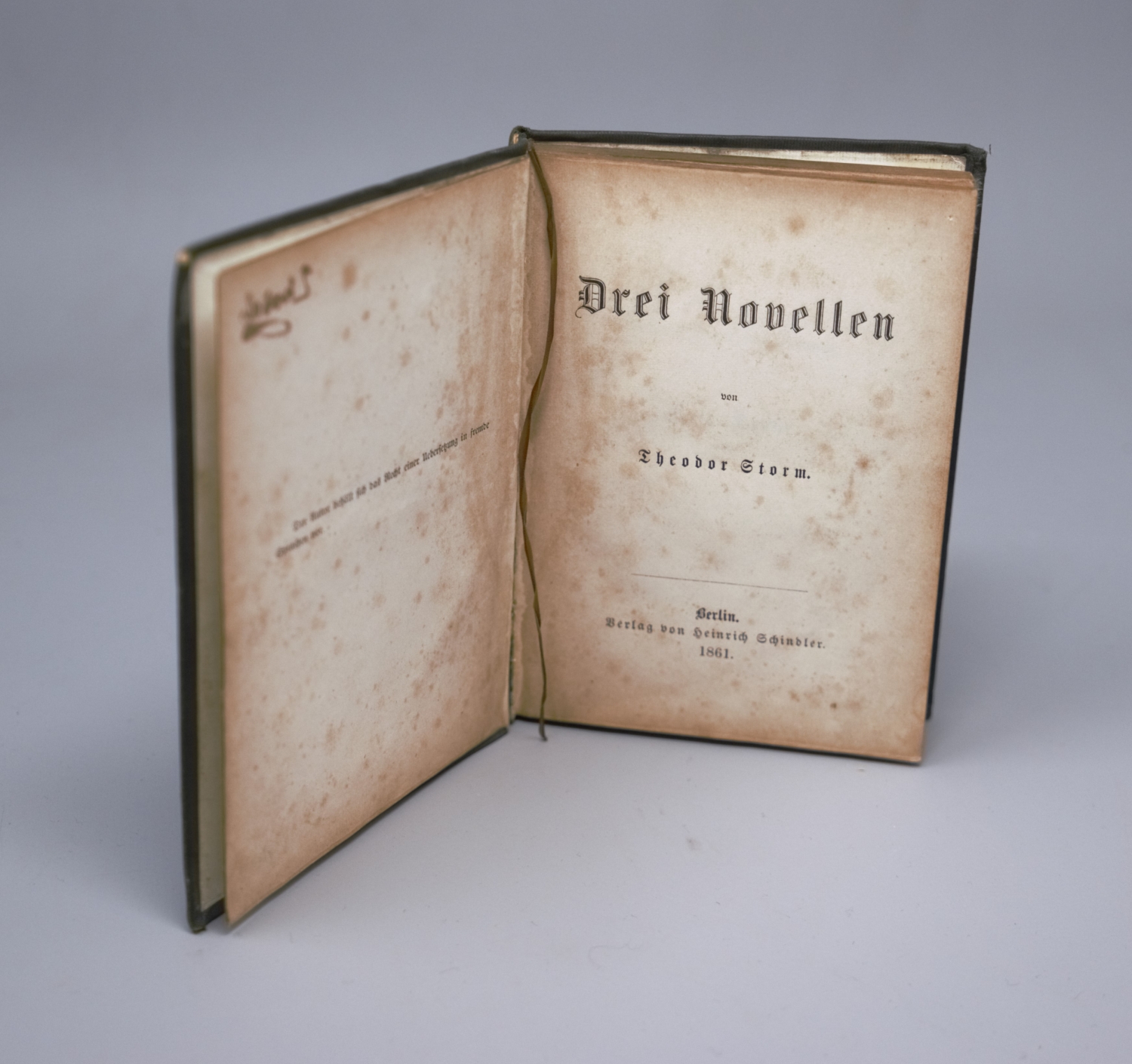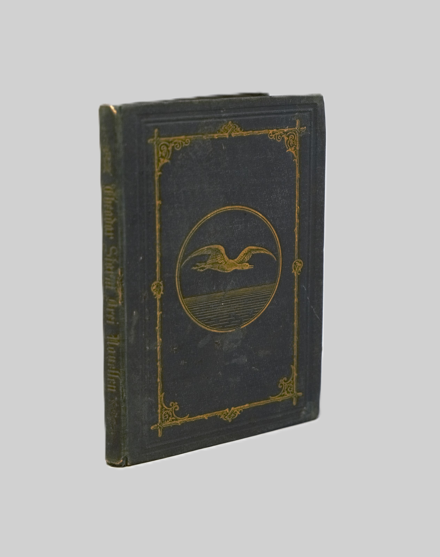 Storm, Theodor. Drei Novellen. 4 Bl., 99 S. 13,5 x 9.5 cm. Grüner illustrierter OLeinenband (fleckig und bestoßen) mit Goldprägung und Goldschnitt. Berlin, Heinrich Schindler, 1861.