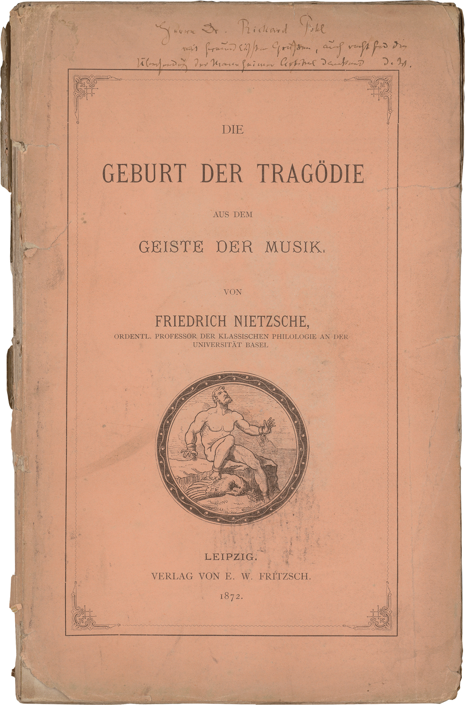 Borst 3167. Krumel I. Kindler XII, 427-429. – Erste Ausgabe von Nietzsches wirkungsmächtiger Basler Frühschrift, die im Mai 1872 erschien und mit der er nicht nur die Welt der klassischen Philologie aus den Angeln hob, hier in einem Exemplar in der seltenen Verlagsbroschur. Exemplar aus der Bibliothek des Komponisten, Musikkritikers und Philosophen Richard Pohl (1826-1896), Bewunderer und Freund Richard Wagners und Nietzsches. Mit entsprechendem Widmungstext auf dem Vorderumschlag: "Herrn Dr. Richard Pohl mit freundlichsten Grüssen, auch recht für die Übersendung der Mannheimer Artikel dankend J. W." Das Monogramm "J. W." konnten wir nicht entschlüsseln. Nietzsches Schrift über Entstehung und Niedergang der griechischen Tragödie, das in einer Auflage von 800 Exemplaren erschien, wurde von der etablierten Philologie aufgrund seiner intuitiven und irrationalen Schlüsse nicht ernst genommen und weitgehend ignoriert, von Wagnerianern hingegen überschwänglich gefeiert. Der junge Wilamowitz-Möllendorff, mit dem Nietzsche gemeinsam in Schulpforta die Schulbank drückte, wagte einen öffentlichen Tadel: "herr Nietzsche tritt ja nicht als wissenschaftlicher forscher auf: auf dem wege der intuition erlangte weisheit wird teils im kanzelstil, teils in einem raisonnement dargeboten, welches dem journalisten nur zu verwandt ist." Erwin Rohde sprang seinem Freund Nietzsche zur Seite und veröffentlichte seine Erwiderungsschrift Afterphilologie, in der er Nietzsches Thesen verteidigt und gegen Wilamowitz polemisiert. – Etwas stockfleckig, mit zahlreichen dezenten Randanstreichungen in Bleistift, die Lagen gelockert oder lose. Unbeschnittenes Exemplar aus der Sammlung des Philologen und Wasserzeichenforschers Karl Theodor Weiß (1872-1945), mit dessen Exlibris auf dem Innenspiegl.