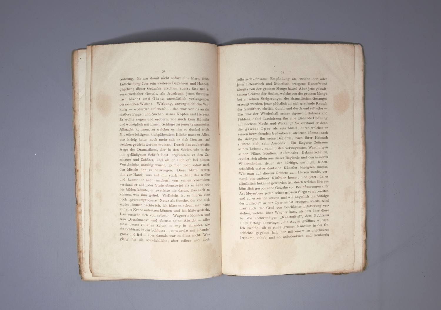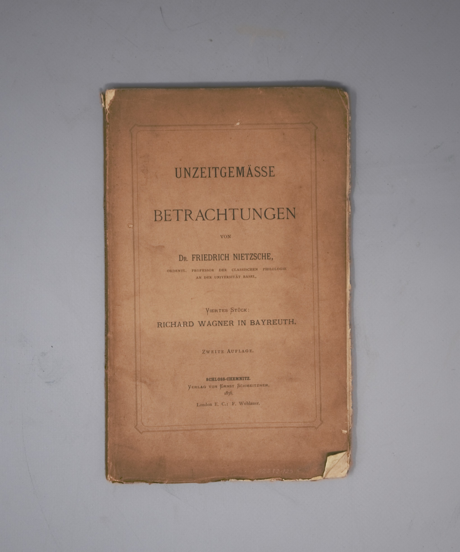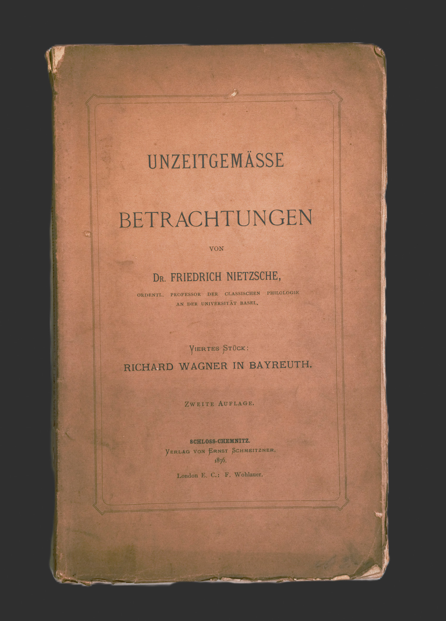 Nietzsche, Friedrich. Unzeitgemässe Betrachtungen. Viertes Stück: Richard Wagner in Bayreuth. 98 S., 1 Bl. 24 x 15 cm. OBroschur (etwas fleckig und berieben, mit kleineren Randläsuren). Chemnitz, Ernst Schmeitzner, 1876.