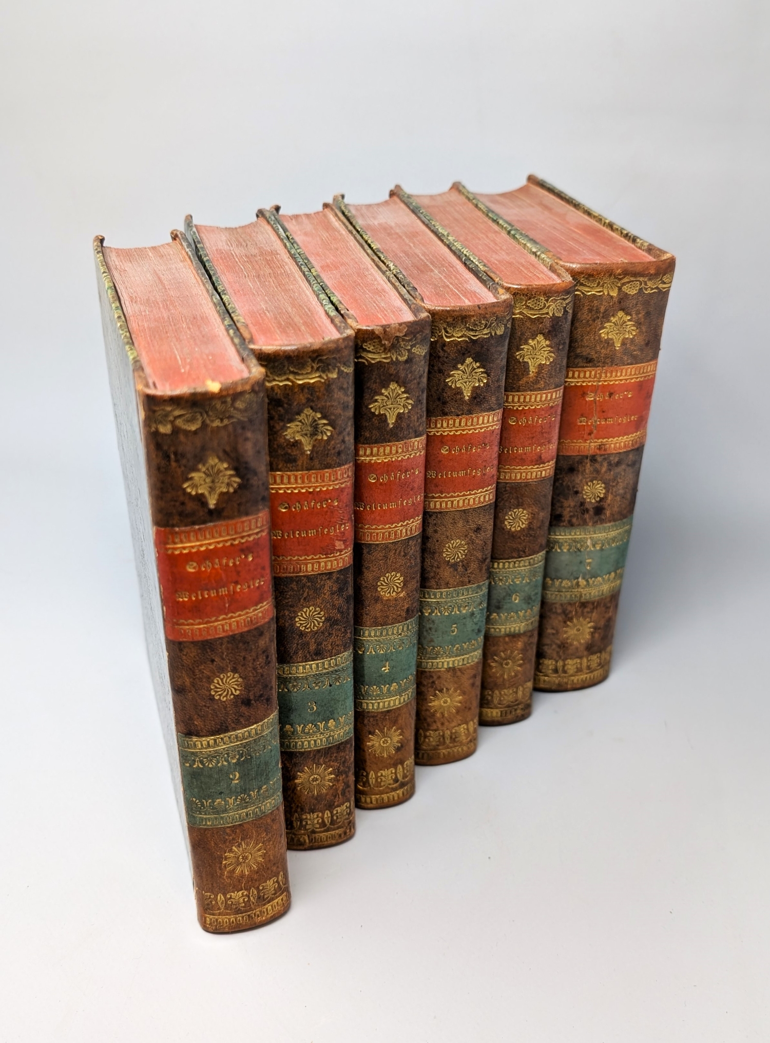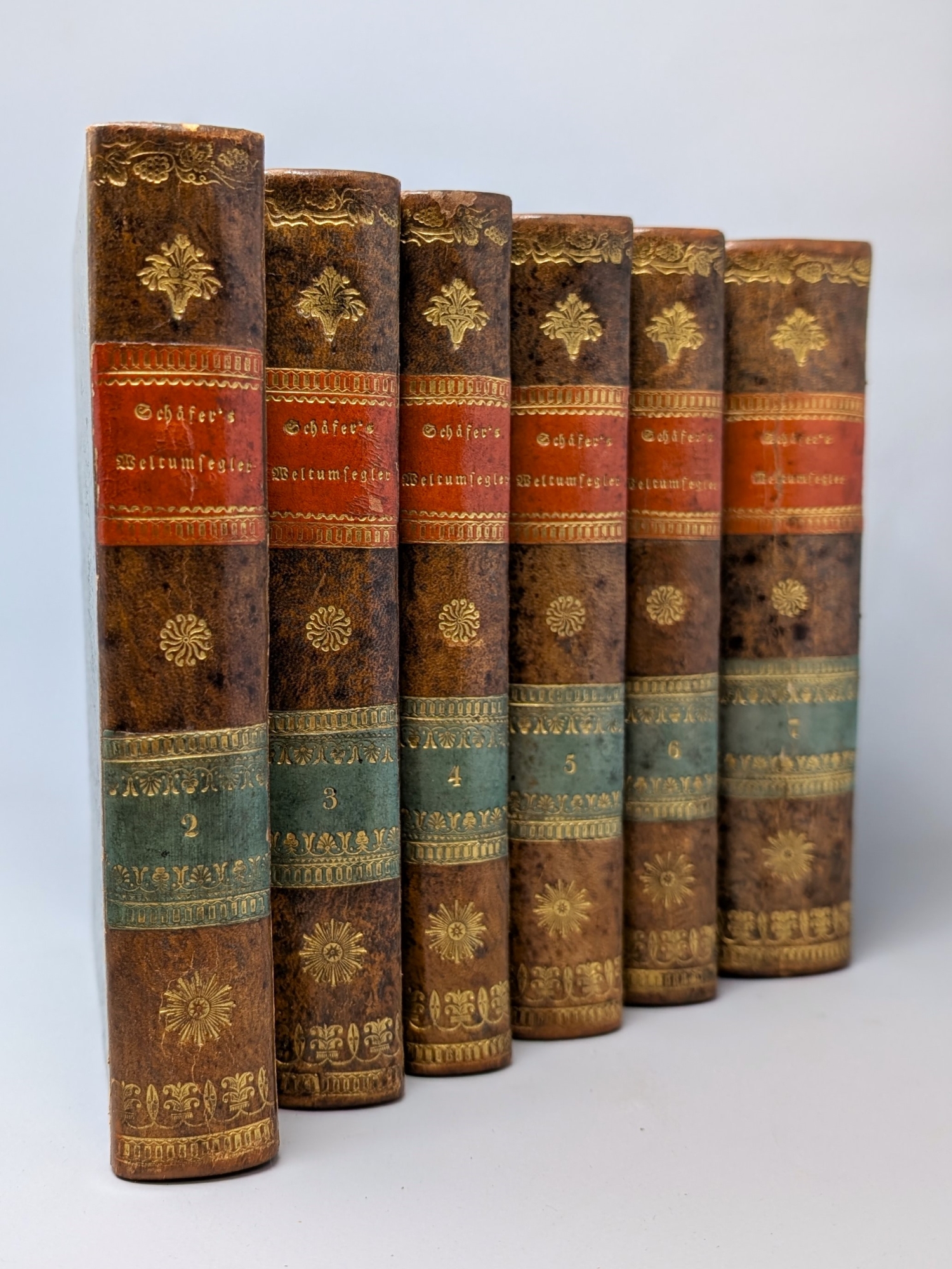 Schäffer, Daniel F. Der Weltumsegler. Oder Reise durch alle fünf Theile der Erde. Zum Selbstunterricht der Jugend. Teile II-VII. 6 Bände. Mit 48 kolorierten Kupfertafeln von Meno Haas, kolorierter gestochener Faltkarte und gefalteter Kupfertafel. 18,5 x 16 cm. Marmorierter Halblederband d. Z. mit ornamentaler RVergoldung und 2 farbigen goldgeprägten RSchildern. Berlin, Oehmigke (Bände II-V) bzw. Neue Societäts-Verlagsbuchhandlung (Band VI) bzw. C. G. Flittner (Band VII), 1803-1817.