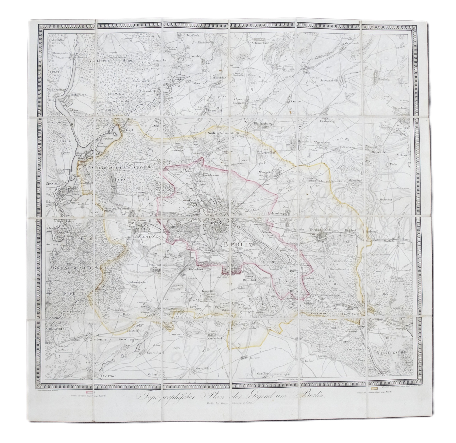 Reymann, Gottlob Daniel. Topographischer Plan der Gegend um Berlin. Grenzkolorierte Kupferstichkarte in 24 Segmenten auf Leinen aufgezogen. 54 x 54 cm. Im modernen Pappschuber. Berlin, Simon Schropp, 1818.