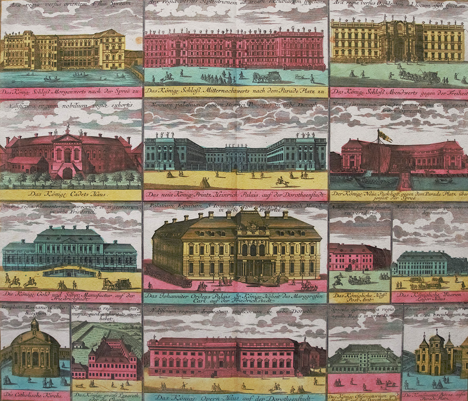 Kiewitz 1254. Gernot Ernst, Seutter, Nr. 2. – Die Graphik ist ein Teil einer großformatigen Ansicht von Berlin, die aus drei insgesamt Platten besteht. Dargestellt werden in 15 kleinen Ansichten Bauten von Berlin, wie zum Beispiel "Das königliche Schloß Morgenwerts nach der Spreezu", "Das königl. Schloß Mitternachtswerts nach dem Parade Platz zu", "Das königl. Schloß Abendwerts gegen der Freiheit", "Das Königl. Cadets Haus", "Das neue König. Printz Heinrich Palais auf der Dorotheenstadt", "Das Johanniter Ordens Palais", etc. – Mit Mittelfalz, leicht braunfleckig, leicht knickspurig sonst gut erhalten.