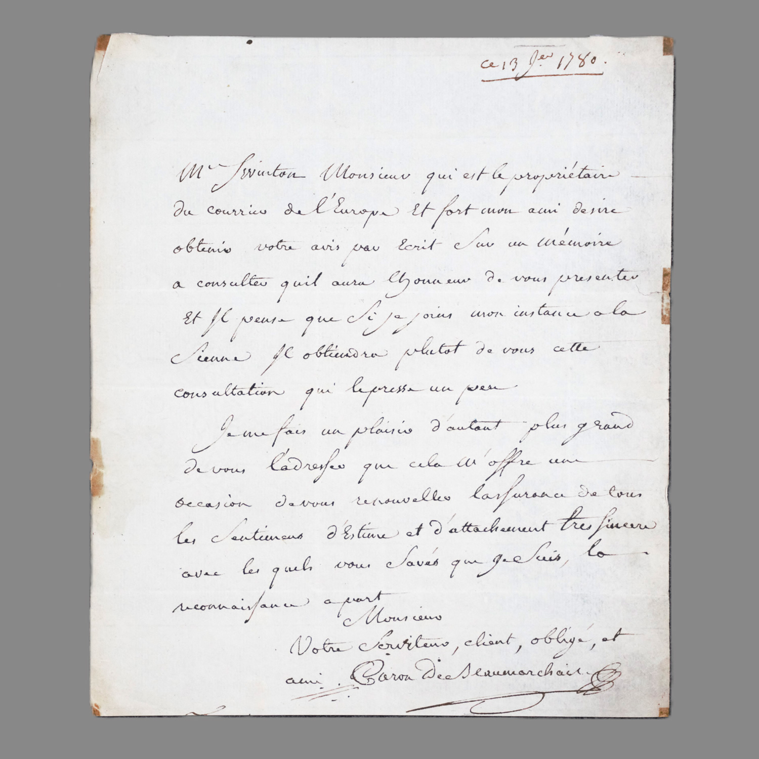 Wohl an einen Redakteur. Beaumarchais schreibt im Auftrag des Londoner Publizisten Samuel Swinton, Herausgeber des "Courrier de l'Europe" (erschienen von 1776 bis 1792). Swinton als Beaumarchais' "ami désire obtenir votre avis par Ecrit sur un mémoire à consulter qu'il aura l'honneur de vous presenter et Il pense que si je joins mon instance à la Sienne Il obtiendra plutôt de vous cette consultation qui le presse un peu ...". Er, Beaumarchais, freue sich, auf diese Weise den Kontakt zu dem Adressaten erneuern zu können. - Am unteren Rand knapp beschnitten; 1 kleiner Einriss.