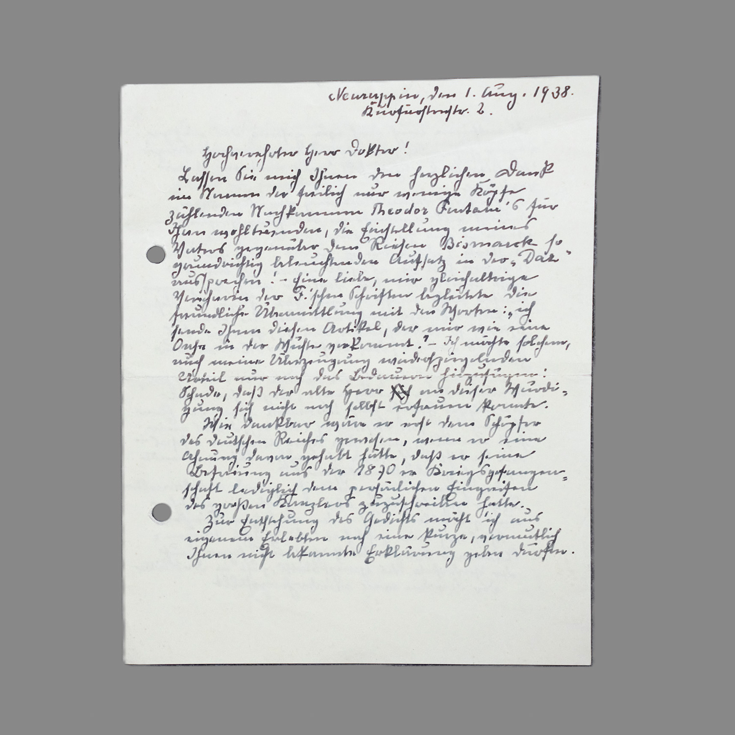 Sehr interessanter Brief an einen "Herrn Doktor", der in der "DAZ" einen Aufsatz über das Verhältnis Fontane-Bismarck veröffentlich hatte. "... Eine liebe, mir gleichaltrige Verehrerin der F.'schen Schriften begleitete die freundliche Übermittlung mit den Worten: 'ich sende Ihnen diesen Artikel, der mir wie eine Oase in der Wüste vorkommt!' - Ich möchte solchem, auch meine Überzeugung widerspiegelnden Urteil nur noch das Bedauern hinzufügen: Schade, daß der alte Herr [d. i. sein Vater Theodor Fontane] an dieser Würdigung sich nicht noch selbst erfreuen konnte. Wie dankbar wäre er erst dem Schöpfer des Deutschen Reiches gewesen, wenn er eine Ahnung davon gehabt hätte, daß er seine Befreiung aus der 1870er Kriegsgefangenschaft lediglich dem persönlichen Eingreifen des großen Kanzlers zuzuschreiben hatte. Zur Entstehung des Gedichts möcht' ich aus eigenem Erlebten noch eine kurze, vermutlich Ihnen nicht bekannte Erklärung geben dürfen. - Ich entsinne mich noch wie gestern des aufgeregten Zustandes, in den die brennende Frage 'Wo Bismarck ruhen soll' auch meinen Vater versetzte. 'Sprich doch Deine Meinung darüber, Papa, deutlich aus, vielleicht in ein paar Versen! - wagte ich ihm zu sagen. 'Nein, dazu bin ich zu alt! Noch vor 10 oder 20 Jahren hätte ich es wohl getan. Ich bin der Verse müde und habe deshalb auch den jungen Kaiser nicht mehr angedichtet. Jetzt, in dieser prekären Frage noch dazu und bei einem historisch so bedeutsamen Anlaß, ist mir das Gezänk darüber, dies Blaffen der Meute, nur zuwider!' ...". - Friedrich Fontane schildert dann, wie Emilie Fontane das doch heimlich verfasste Gedicht ihres Mannes zum Chefredakteur der Vossischen Zeitung, Friedrich Stephany, brachte, der es eher unwillig annahm mit den Worten "Warum ein Gedicht? Ich werde es nachher lesen." Das Gedicht sei dann doch auf der Titelseite der Vossischen Zeitung erschienen und später im Friedrichsruher Bismarck-Mausoleum in Stein gemeisselt worden. In zwei Briefen an Ernst Heilborn (Nr. 852 und 853 in Band IV der Hanser-Briefausgabe) hat der Dichter sich selbst zu der Angelegenheit geäußert. - Gelocht.