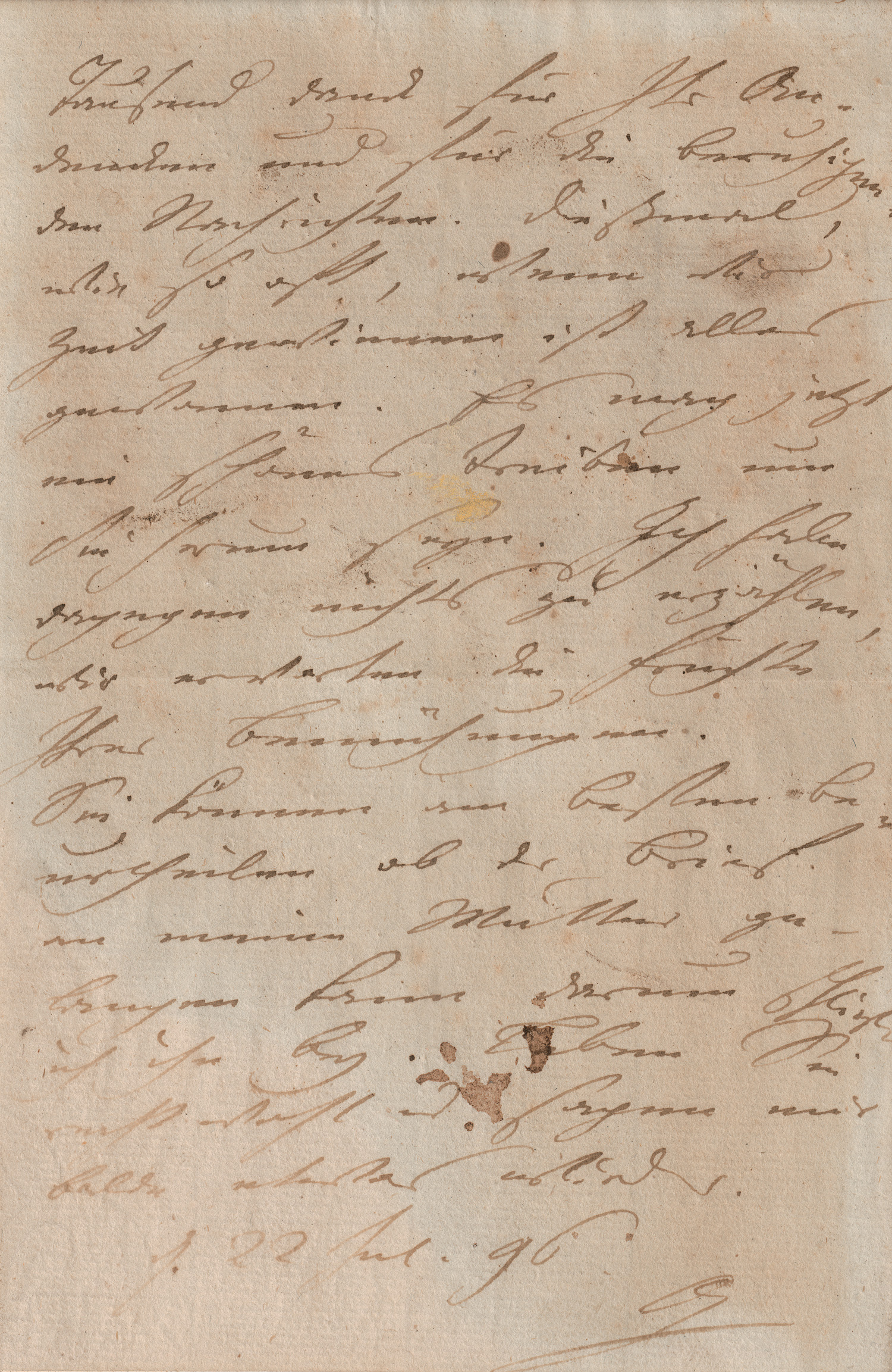 Eigenhändig an den sachsen-weimarischen Geheimen Rat und späteren Staatsminister Christian Gottlob von Voigt, der sich wohl in Jena aufhielt und von den neuesten Ereignissen des Krieges gegen Frankreich berichtet hatte. "Tausend Dank für Ihr Andenken und für die beruhigenden Nachrichten. Dießmal, wie so oft, wenn wir Zeit gewinnen ist alles gewonnen. Es mag jetzt ein schönes Treiben um Sie herum seyn. Ich habe dagegen nichts zu erzählen, wir erwarten die Früchte Ihrer Bemühungen. - Sie können am besten beurtheilen ob der Brief an meine Mutter gelangen kann. Darum schließe ich ihn bey ...". - Sophienausgabe 3347. - Etwas fleckig.