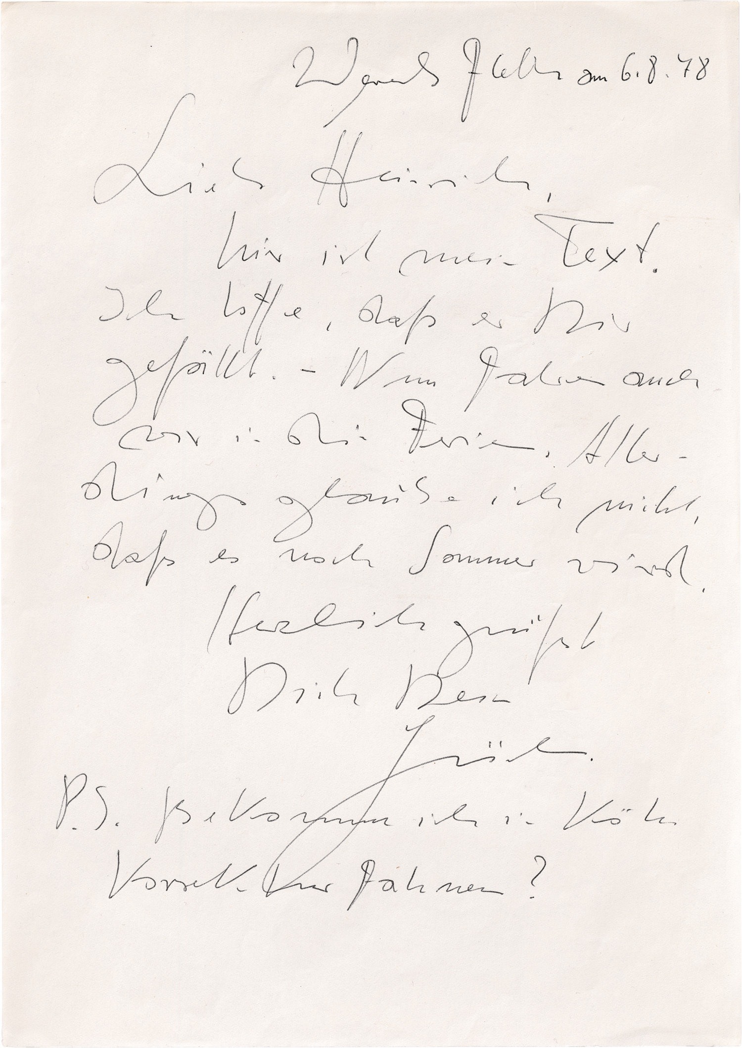 An den ihm befreundeten Literatur- und Theaterkritiker, Essayisten und Rundfunk-Autor Heinrich Vormweg (1928-2004) in Köln. Oft inhaltsreiche Briefe über literarische Themen, größtenteils über die von Heinrich Böll, Günter Grass und Carola Stern herausgegebene Zeitschrift "L 76". Einige Zitate: "... Sie haben den 'L 76'-Musterband liegen lassen und sonst noch einige Unterlagen. Unser Gespräch war nützlich ... Die zwei Kapitel und das Gedicht 'Lena teilt Suppe aus' schicke ich Ende April. Mit meinem Artikel (ca 10 Seiten) zum Radikalenerlaß können Sie Ende Mai rechnen [19.III.1976] ... noch kurz einige Bemerkungen zu Nr. 1 'L 76'. Wichtig ist sicher, daß Sie als Redakteur einen Eingangsartikel schreiben, in dem die Ziele und Vorstellungen von 'L 76' umrissen werden. Notwendig wird es sein, auf den Ausgangspunkt 'Listy' und den vorerst gescheiterten Reformversuch der tschechoslowakischen Sozialisten und Kommunisten hinzuweisen. Es ist ja doch so, daß das, was in Prag verhindert wurde, bis in unsere Tage hinein - sei es in Italien und Frankreich, sei es in Portugal und Spanien, aber auch in der Bundesrepublik - 'Wirkung' zeigt. Der Anteil der Schriftsteller an dieser Entwicklung ist kein geringer gewesen. Im Grunde hat sich an der Problemstellung des Briefwechsels zwischen Pavel Kohout und mir bis heute nichts geändert; allenfalls ist noch deutlicher geworden, daß sich der Sozialismus nicht verwirklichen läßt, wenn er mit dem Verlust demokratischer Grundrechte erkauft werden muß [24.III.1976] ... Gestern war ich in Ostberlin bei Biermann ... Ich erzählte Biermann von 'L 76', und er gab mir seine 'Ballade vom Aale-Räuchern' zum Abdruck ... Die Ballade ist ein echter Biermann: mecklenburgische DDR-Realität plus Knast und verzweifeltem Raunzen [26.III.1976] ... ich glaube, wir duzen uns seit der letzten Buchmesse. Jedenfalls dämmert mir soetwas. Sollte mich aber meine partielle Volltrunkenheit am Abend des letzten Tages getäuscht haben, bitte ich Dich trotzdem, es beim Du zu lassen ... Ich werde mich am 4. Oktober hinsetzen und versuchen, über das Wahlergebnis zu schreiben. Viel Zeit habe ich nicht, da ich am 7. nach Mailand fahre, um dort eine Ausstellung meiner Grafiken zu eröffnen [27.IX.1976] ... Seit einigen Tagen aus den Vereinigten Staaten zurück, finde ich hier einen Brief, das Antwortschreiben des Justizministeriums der CSSR auf einen Brief hin, den Heinrich Böll, Max Frisch und ich (womöglich noch andere) geschrieben haben [27.IV.1977] ... Anbei drei nachgelassene Gedichte von Günter Bruno Fuchs, die mir Michael Krüger für 'L 76' geschickt hat. 'Gesellschaftskunde' gefällt mir recht gut [12.V.1977] ... Auf dem Bloch-Begräbnis traf ich Fritz J. Raddatz, der gerne für 'L 76' einen Bloch-Nachruf schreiben würde. Nur will er sich als Autor nicht aufdrängen ..." [23.VIII.1977].