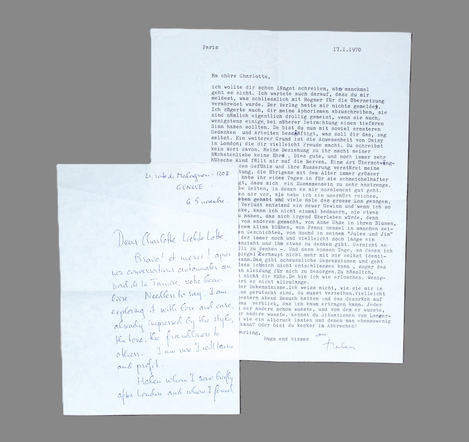 An die Ärztin, Psychologin, Chirologin, Sexualwissenschaftlerin und Schriftstellerin Charlotte Wolff. Neben geplanten Veröffentlichungen vor allem Bekenntnisse über ihr Leben. "... Ich habe Zeiten, in denen es mir moralement gut geht. Da kommt es mir vor, als habe ich ein unerhört reiches, dichtes Leben gehabt und viele Male das grosse Los gezogen. Aus jedem Verlust entstand ein neuer Gewinn und wenn ich so zurückblicke, kann ich nicht einmal bedauern, nie etwas kreiert zu haben, das mich irgend überleben würde, denn das wurde von anderen gemacht ... von Franz Hessel in manchen seiner stillen Geschichten, von Roché in seinem 'Jules und Jim', dem Film, der immer noch und vielleicht noch lange ein Publikum anzieht und ihm etwas zu denken gibt. Garnicht an Kadi [ihren Sohn Stéphane] und Uli zu denken - . Und dann kommen Tage, an denen ich mich im Spiegel überhaupt nicht mehr mit mir selbst identifizieren kann. Das gibt scheussliche Depressionen ...". - Dabei: Stéphane Hessel, gen. "Kadi", Helens Sohn, ein französischer Diplomat, Lyriker, Essayist und politischer Aktivist (1917-2013). Eigh. Brief m. U. "KADI". In einem Gemisch von Französisch, Englisch und Deutsch. 13/4 S. Gr. 8vo. Genf 5.XI. o. J. - Gleichfalls an Charlotte Wolff, u. a. über ein Buch von ihr. "... Needless to say, I am exploring it with love and care, already impressed by the style, the tone, the friendliness to others. I am sure I will learn and profit ...".
