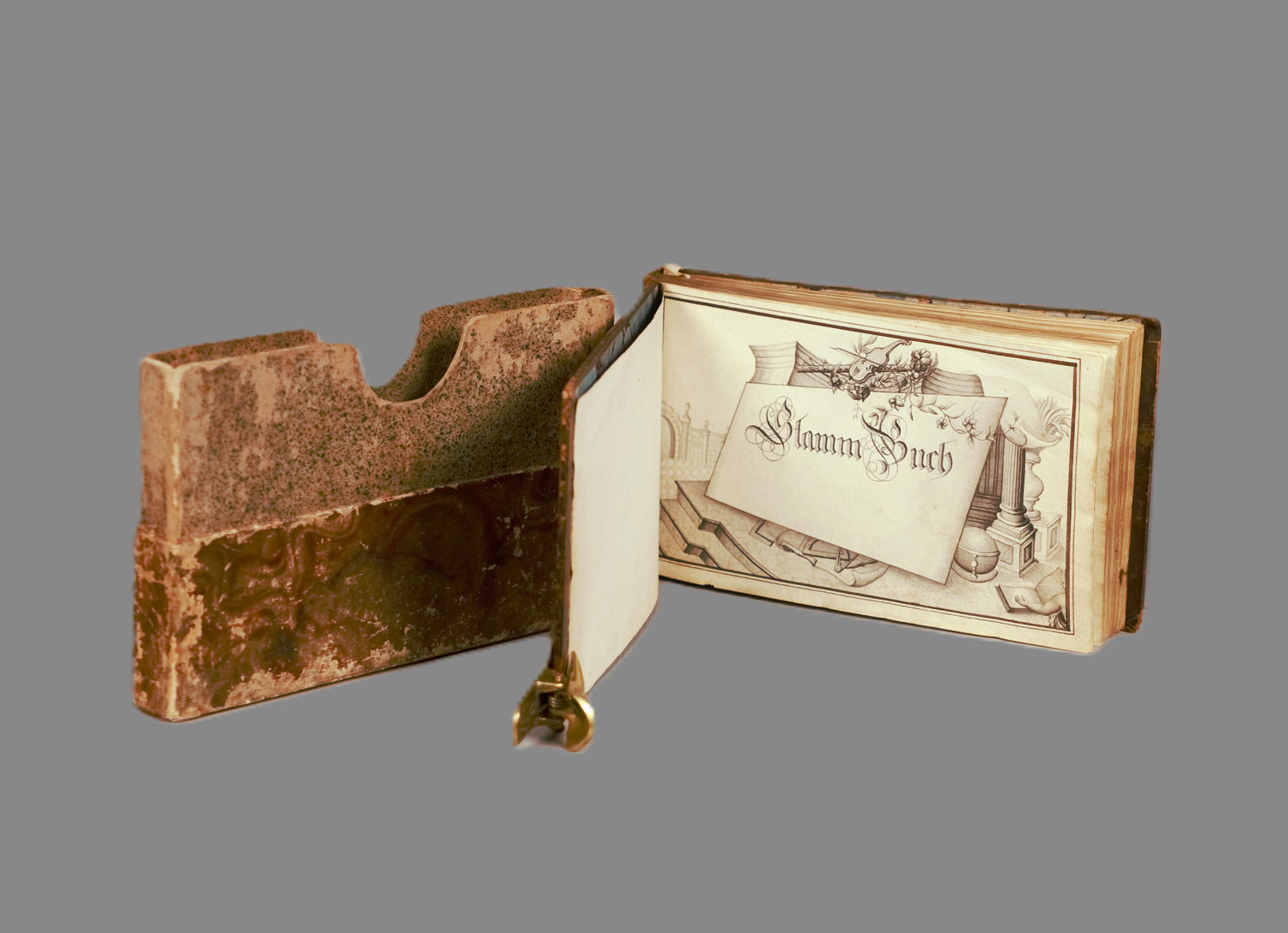 Stammbuch des H. Pilgrim aus Königsborn bei Unna. Ca. 120 Bl., davon ca. 59 S. beschrieben oder illustriert. Mit 5 Grisaille-Zeichnungen. Quer-gr. 8vo. Marmor. Lederband d. Z. (etwas berieben) mit goldgepr. Bordüren auf beiden Deckeln, Rückenvergoldung und Rückenschild "Stammbuch H. P." sowie Goldschnitt und marmor. Vorsätzen. Im Pappschuber d. Z. (Oberteil fehlt). 1771-1802.