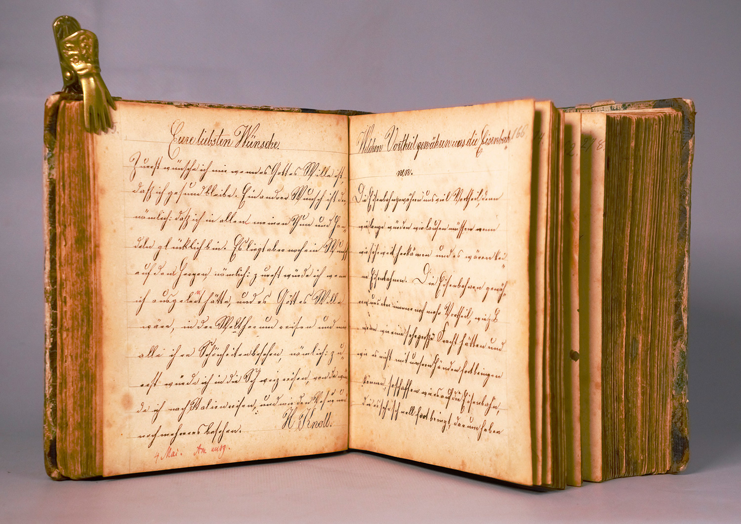 Interessante, sehr große Sammlung von mehreren hundert kurzen Aufsätzen und Brieftexten, deren Themen dem Schüler Hermann Knoll von seinem Lehrer G. Guth jeweils gestellt wurden, der die Texte dann nach Abschluß mit roter Tinte beurteilte und oft auch datierte. Vom Lehrer gewählt sind alle nur denkbaren Themen des Universums, Naturkunde, Ethik, Pädagogik, Politik, Heimatkunde, Geschäftsleben und vieles mehr. Einige Beispiele: "Wie soll der Mensch seine Herrschaft über die Thiere ausüben? - Die Eigenschaften des Mannes. - Die Leipziger Messe. - Woher kommt bei vielen Menschen die allzugroße Todesfurcht? - An welchen Natur- und Kunstproducten ist Sachsen unser Vaterland reich? - Was gibt dir das Pflanzenreich für deine Nahrung, Kleidung und Wohnung? - Nicht jegliches Unglück ist Strafe. - Die Jesuiten, ihre Entstehung und ihre Wirksamkeit. - Ein Schuldschein (Obligation). - Der Rossplatz zu Leipzig an einem Messsontage. Eine Beschreibung. - Die diesjährige Michaelisschulprüfung in einem Briefe an einen abwesenden Schulkameraden. - Unter welchen Bedingungen ist es möglich, daß der Lehrer segensreich in seiner Schule wirken kann?" usw. Auffallend ist, dass Knolls Lehrer den Schüler fast niemals tadelt, sondern ihn aufmuntert, anspornt und an jedem Aufsatz etwas Lobenswertes findet.