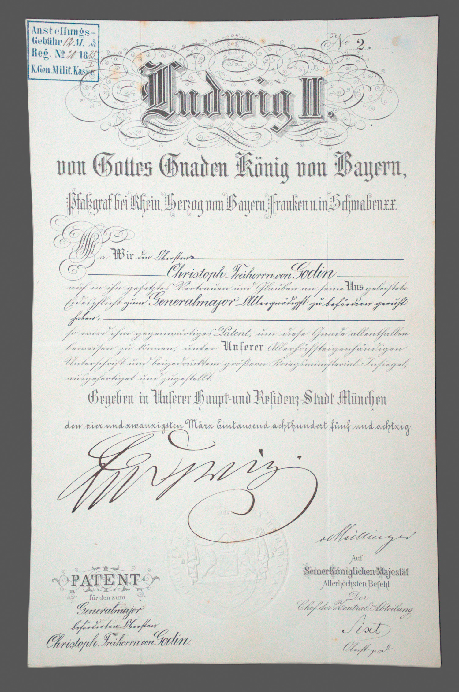 Beförderung des Obersten Christoph Freiherrn von Godin zum Generalmajor. - Gegengezeichnet vom bayerischen Kriegsminister Joseph Ritter von Maillinger, fünf Wochen vor dessen Entlassung. - Etwas eng beschnitten; dennoch dekorative Urkunde.