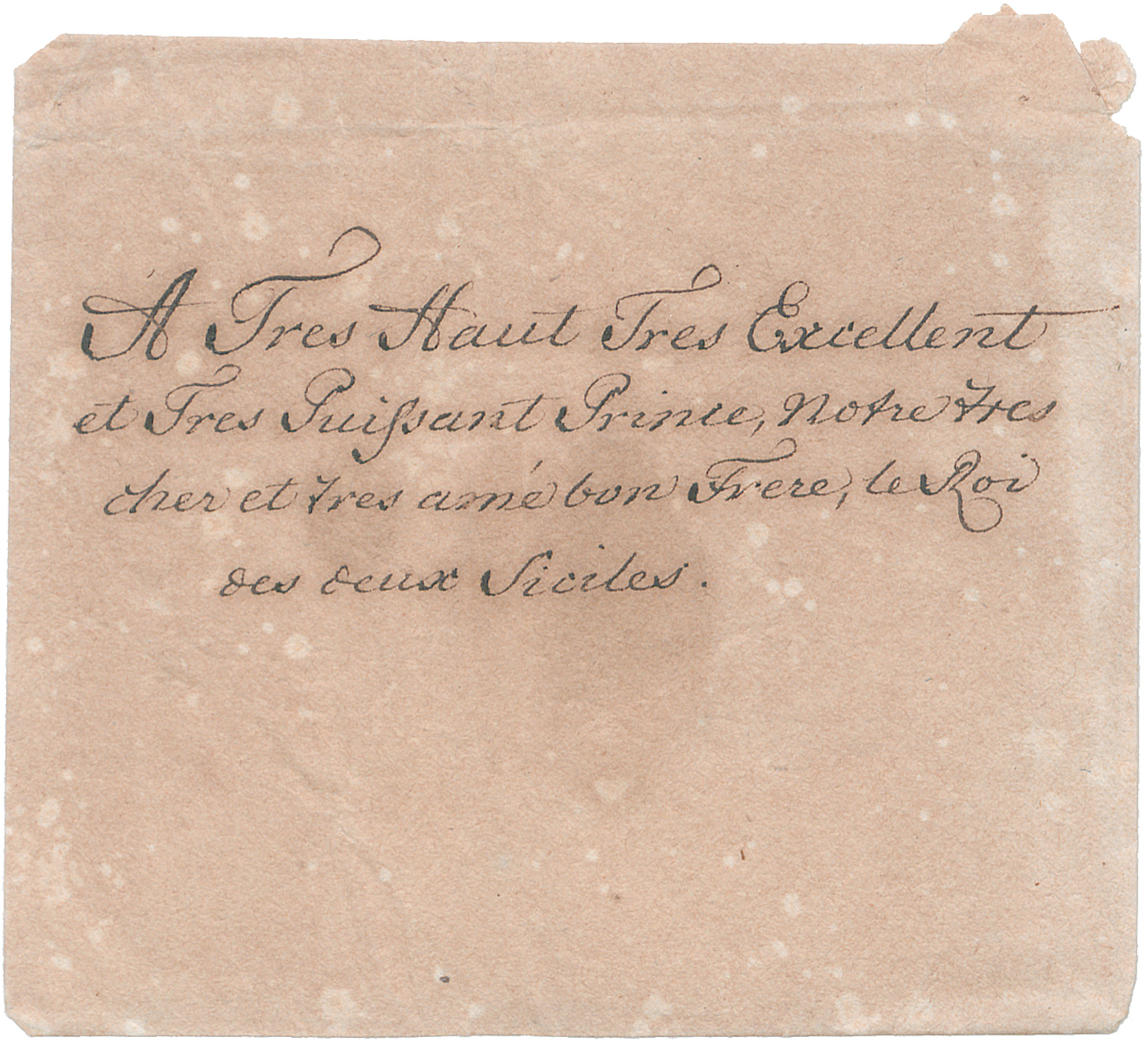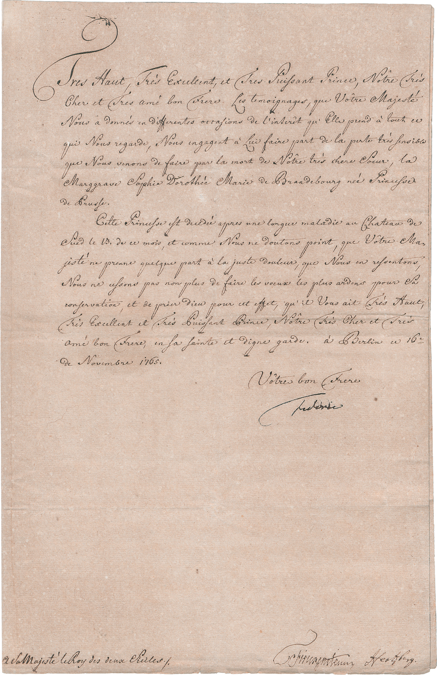 An Ferdinand IV., König beider Sizilien, mit der Nachricht vom Tod seiner Schwester, der Markgräfin Sophie von Brandenburg-Schwedt. "... cette Princesse est decedée apres une longue maladie au Chateau de Sued le 13. de ce mois, et comme Nous ne doutons point, que Vôtre Majesté ne prenne quelque part à la juste douleur, que Nous en ressentons, Nous ne cessons pas non plus de faire le voeux les plus ardens pour Sa conservation ...". Mit Gegenzeichnung der beiden Minister Graf Finck von Finckenstein und Graf Hertzberg. - Unter den vielen Zuschriften an den König Ferdinand gehören Briefe Friedrichs des Großen zu den seltensten, zumal mit dem wohlerhaltenen Umschlag. - Gleichmäßig etwas gebräunt.