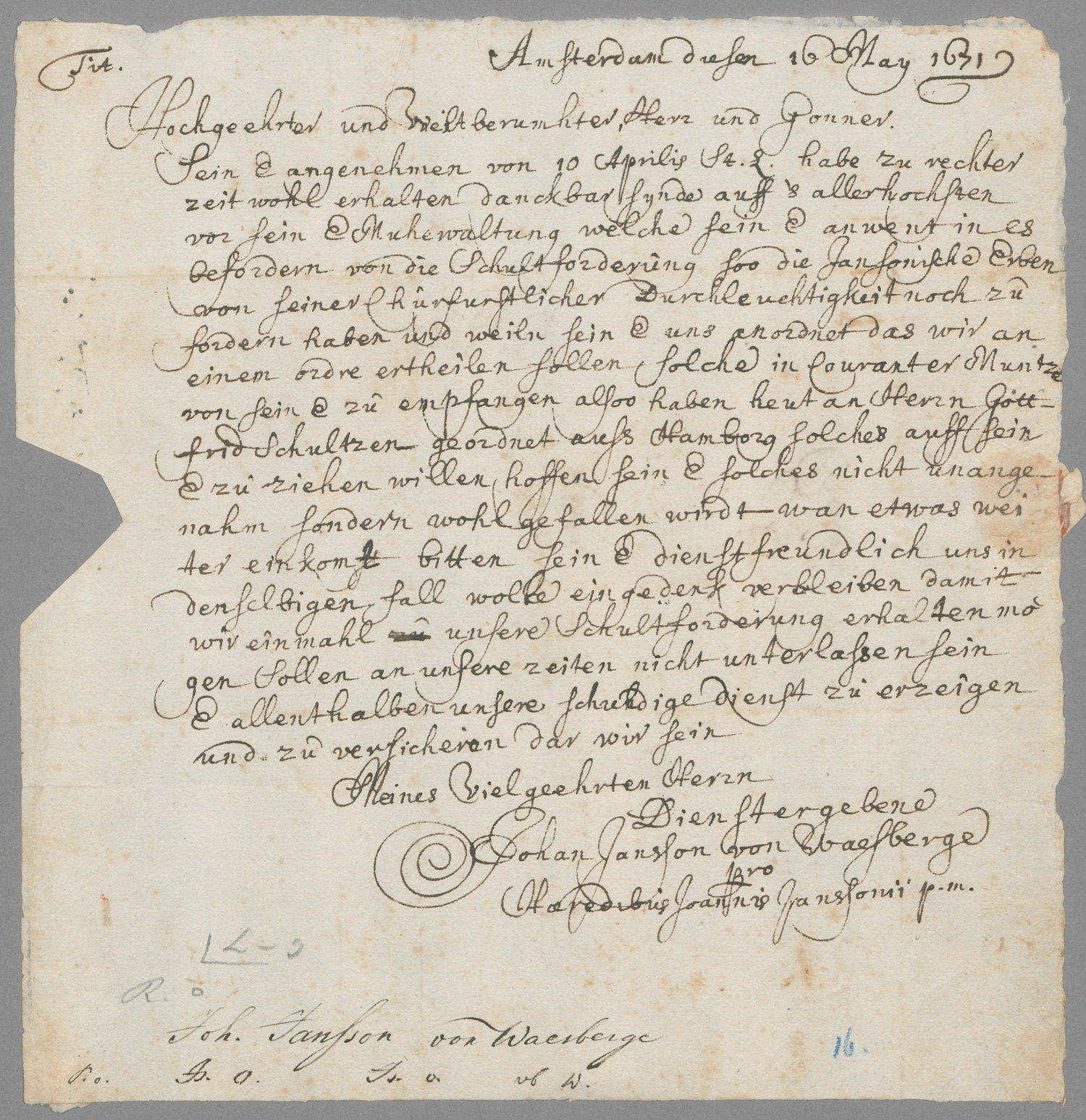 An Gottfried Sturm in Berlin, offenbar einen Finanzverwalter des Großen Kurfürsten Friedrich Wilhelm von Brandenburg. Mahnt im Namen der Janssonius Erben beim Kurfürsten die Begleichung immer noch bestehender Schulden an. "... Sein E angenehmen von 10 Aprilis ... habe zu rechter zeit wohl erhalten. Danckbar synde auff das allerhochsten vor sein E Muhewaltung welche sein E anwent in das befordern von die Schultforderung soo die Jansonische Erben von Seiner Churfurstlichen Durchleuchtigkeit noch zu fordern haben und weiln sein E uns anordnet das wir an einem ordre ertheilen sollen solche in couranter Muntze von sein E zu empfangen alsoo haben heut an Herrn Gottfrid Schultzen geordnet aufss Hamborg solches auff sein E zu ziehen, hoffen sein E solches nicht unangenahm sondern wohl gefallen wirdt wan etwas weiter einkomt ...". - Der Kurfürst war zu dieser Zeit in einen Konflikt mit Frankreich verwickelt und hatte 6 Tage zuvor ein erpresserisches Angebot Frankreichs abgelehnt, einen Neutralitätsvertrag abzuschließen, wenn er nicht wolle, dass französische Truppen in das brandenburgische Cleve einrücken.