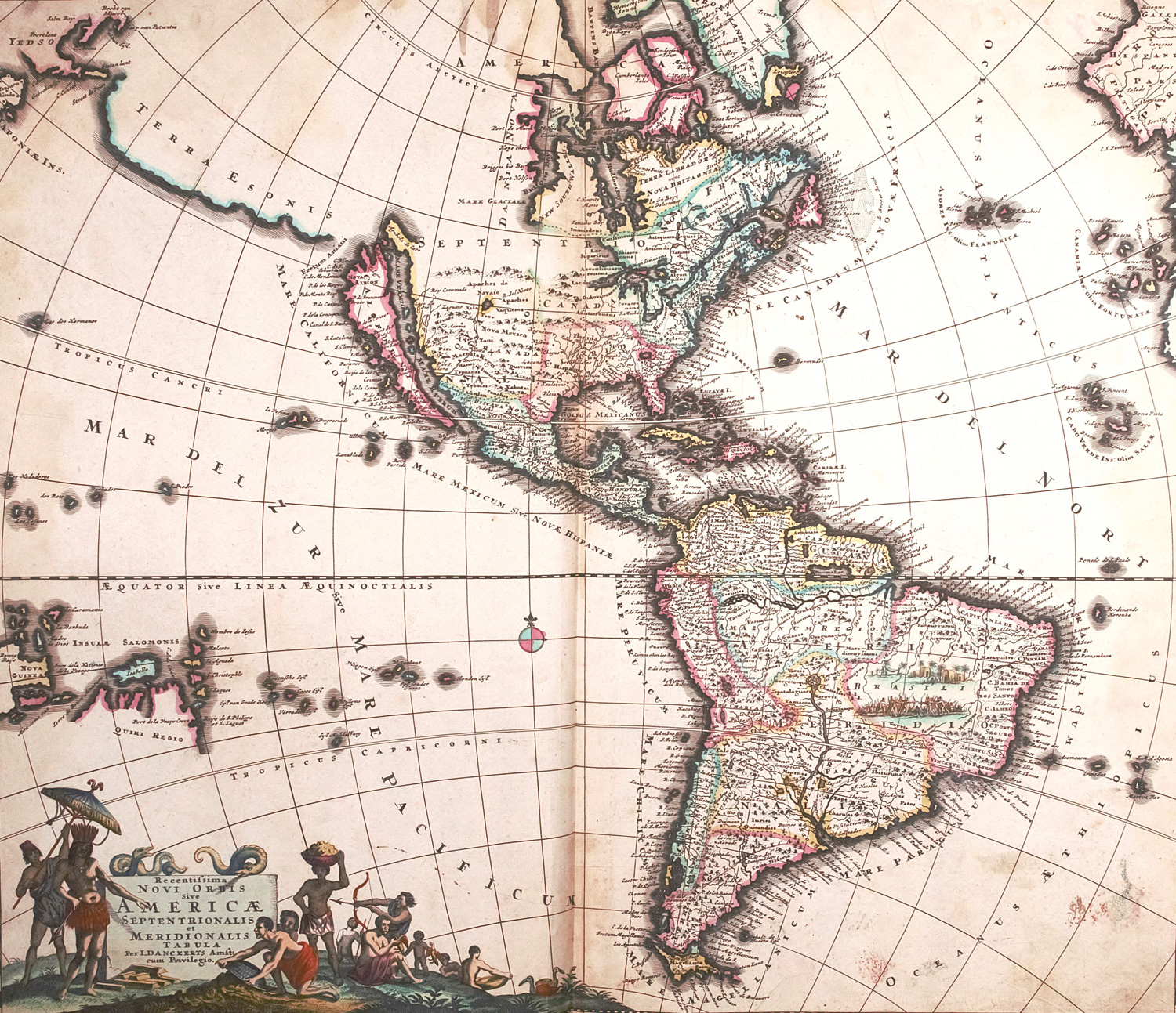 Danckerts, Justus. Recentissima novi orbis sive Americae septentrionalis et meridionalis tabula. Grenzkolorierte Kupferstichkarte. 50 x 58 cm (Plattenrand). Amsterdam um 1700.