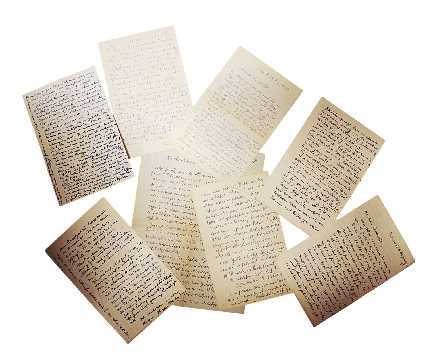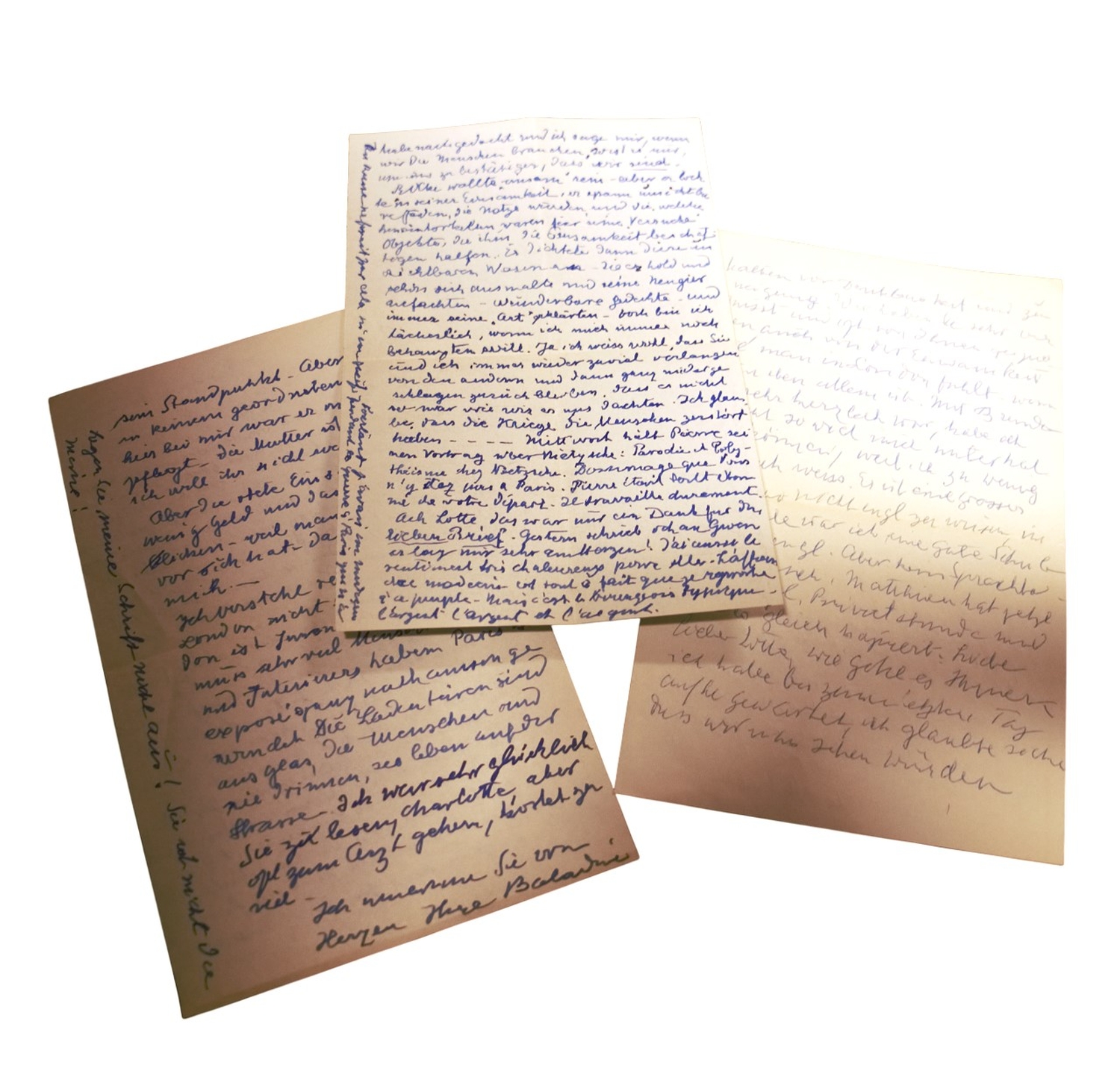 Balthus (d. i. Balthasar Klossowski de Rola, poln.-dt.-franz. Maler, 1908-2001). - Klossowska, Baladine, Malerin, die Mutter von Balthus, Schwester des Malers Eugen Spiro, Geliebte Rainer Maria Rilkes, Galeristin in Paris und Berlin (1886-1969). 6 eigh. Briefe m. U. "Baladine", "Bal" oder "B." In deutscher und teilweise franz. Sprache. Zus. 20 S. Gr. 8vo und gr. 4to. (Paris) 1957 bzw. o. J.