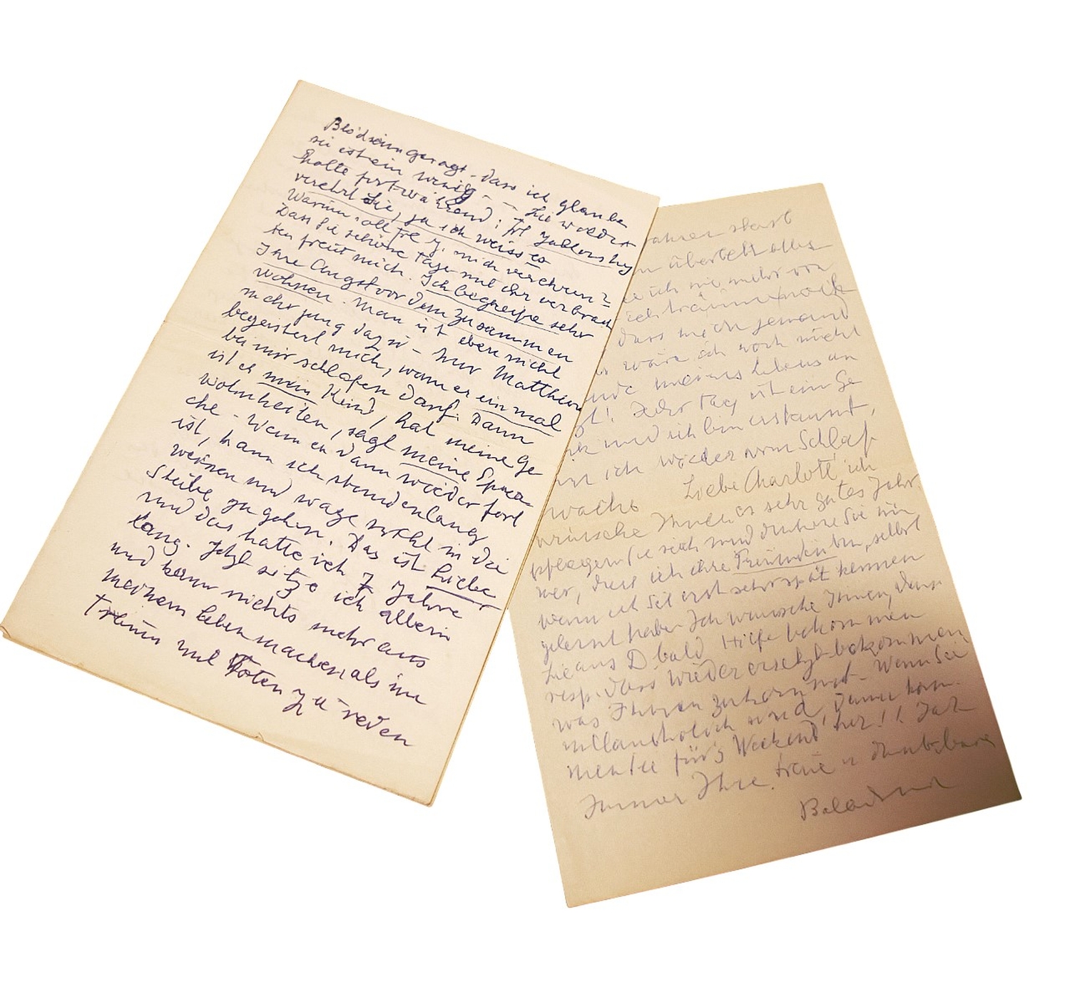 An die Ärztin, Psychologin, Chirologin, Sexualwissenschaftlerin und Schriftstellerin Charlotte Wolff. Inhaltsreiche Briefe über Familie und Freunde sowie über eigenes Dasein und Empfinden. Sie schwärmt für R. M. Rilke, ihren einstigen Geliebten, den Patenonkel und Namensgeber ihres Sohnes Balthus: "... ich schlief heute nacht bis 21/2 und wachte, indem ich bis in den Morgen hinein im dicken Gedichtband von R. las; ich komme nicht von ihm los und weinend bin ich gegen 1/2 6 eingeschlafen. Ach Lotte, der hat mich nicht geliebt und ich habe sehr viel Schuld daran und ich gräme und gräme mich zu Tode ... Rilke wollte 'einsam' sein - aber er lockte in seiner Einsamkeit, er spann unsichtbare Fäden, die Netze wurden, und die, welche hineintorkelten, waren für seine 'Versuche' Objekte, die ihm die Einsamkeit beschäftigen halfen. Er dichtete dann diese unsichtbaren Wesen an - die er hold und schön sich ausmalte und seine Neugier entfachten - wunderbare Gedichte - und immer seine Art erklärten ...". Öfter kommt sie auf ihren Sohn Pierre Klossowski und vor allem auf ihren Enkel Matthieu zu sprechen. Ferner über verschiedene Verwandte und Freunde. Und Rilke taucht immer wieder in den Briefen auf.