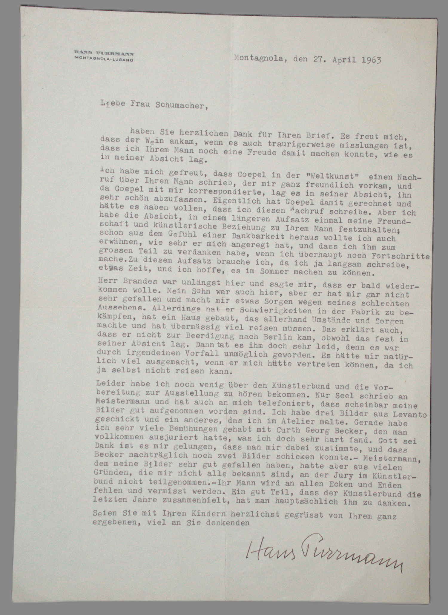 An die Witwe des kurz zuvor verstorbenen Malers, Graphikers und Berliner Hochschullehrers Ernst Schumacher (1905-1963). 1 S., eng beschrieben. Gr. 4to. Montagnola 27.IV.1963. "... Ich habe mich gefreut, dass Goepel in der 'Weltkunst' einen Nachruf über Ihren Mann schrieb, der mir ganz freundlich vorkam, und da Goepel mit mir korrespondierte, lag es in seiner Absicht, ihn sehr schön abzufassen ... ich habe die Absicht, in einem längeren Aufsatz einmal meine Freundschaft und künstlerische Beziehung zu Ihrem Mann festzuhalten; schon aus dem Gefühl einer Dankbarkeit heraus wollte ich auch erwähnen, wie sehr er mich angeregt hat, und dass ich ihm zum grossen Teil zu verdanken habe, wenn ich überhaupt noch Fortschritte machen ... Leider habe ich noch wenig über den Künstlerbund und die Vorbereitung zur Ausstellung zu hören bekommen. Nur Seel schrieb an Meistermann und hat auch an mich telefoniert, dass scheinbar meine Bilder gut aufgenommen worden sind. Ich habe drei Bilder aus Levanto geschickt und ein anderes, das ich im Atelier malte. Gerade habe ich sehr viele Bemühungen gehabt mit Curth Georg Becker, den man vollkommen ausjuriert hatte, was ich doch sehr hart fand ... Meistermann, dem meine Bilder sehr gut gefallen haben, hatte aber aus vielen Gründen, die mir nicht alle bekannt sind, an der Jury im Künstlerbund nicht teilgenommen. - Ihr Mann wird an allen Ecken und Enden fehlen und vermisst werden. Ein gut Teil, dass der Künstlerbund die letzten Jahre zusammenhielt, hat man hauptsächlich ihm zu danken ...". - Beiliegend die Fotokopie (2 Bl.) eines Briefes von Peter Janssen mit einer Würdigung Ernst Schumachers.