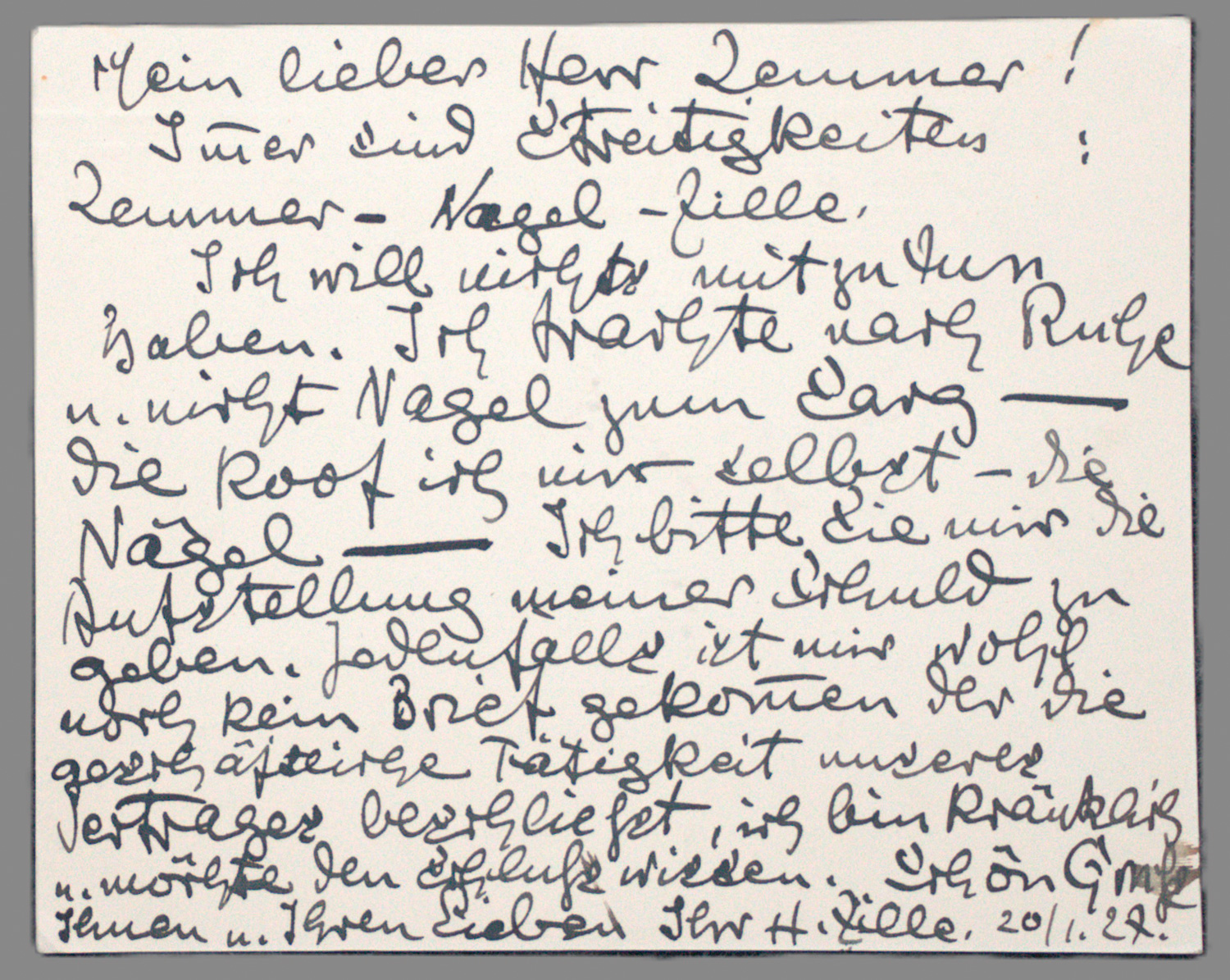 An den Verleger Konrad Lemmer. "... Immer sind Streitigkeiten: Lemmer - Nagel - Zille. Ich will nichts mit zu tun haben. Ich trachte nach Ruhe u. nicht Nagel zum Sarg - die koof ich mir selbst - die Nägel - Ich bitte Sie mir die Aufstellung meiner Schuld zu geben. Jedenfalls ist mir wohl noch kein Brief gekommen der die geschäftliche Tätigkeit unseres Vertrages beschließt, ich bin kränklich u. möchte den Schluß wissen ...". - Geschrieben auf der Rückseite einer gedruckten Werbekarte für eine Zille-Ausstellung in der Kunsthandlung Sagert, Potsdamer Straße in Berlin W 35.