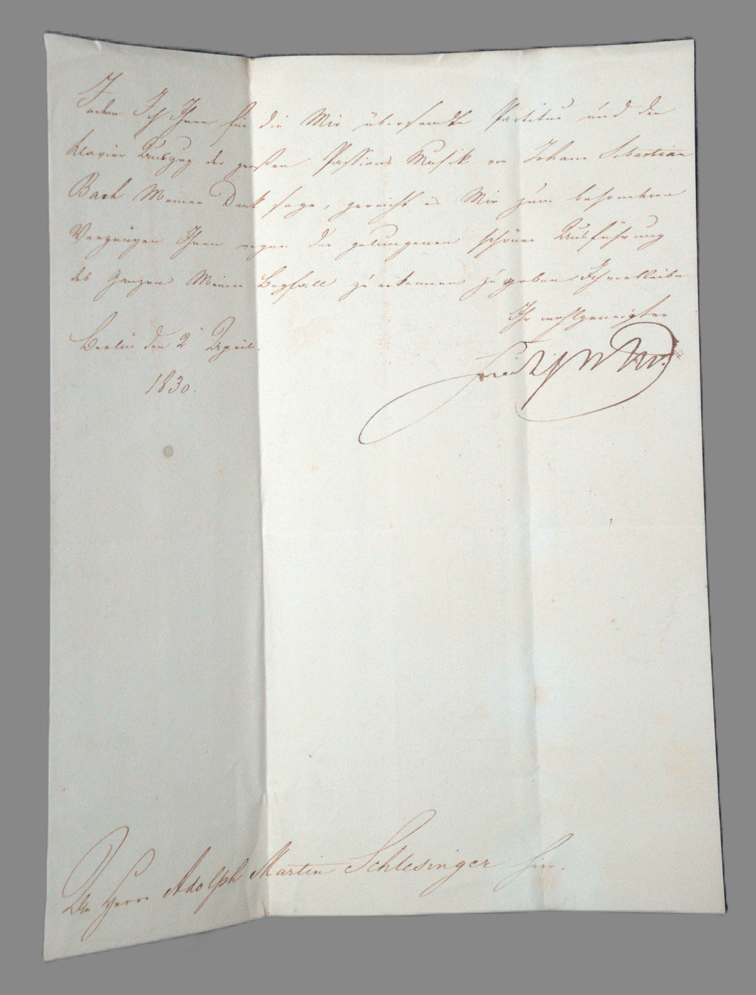 An den Berliner Verleger und Musikalien-Händler Adolph Martin Schlesinger. "Indem ich Ihnen für die Mir übersandte Partitur und den Klavier Auszug der großen Passions Musik von Johann Sebastian Bach Meinen Dank sage, gereicht es Mir zum besondern Vergnügen, Ihnen wegen der gelungenen schönen Ausführung des Ganzen Meinen Beyfall zu erkennen zu geben ...". - Am 11. März 1829 war Bachs Matthäuspassion im Gebäude der Berliner Singakademie in der Bearbeitung von Felix Mendelssohn Bartholdy mit großem Erfolg uraufgeführt worden. Partitur und Klavierauszug erschienen dann bei A. M. Schlesinger.