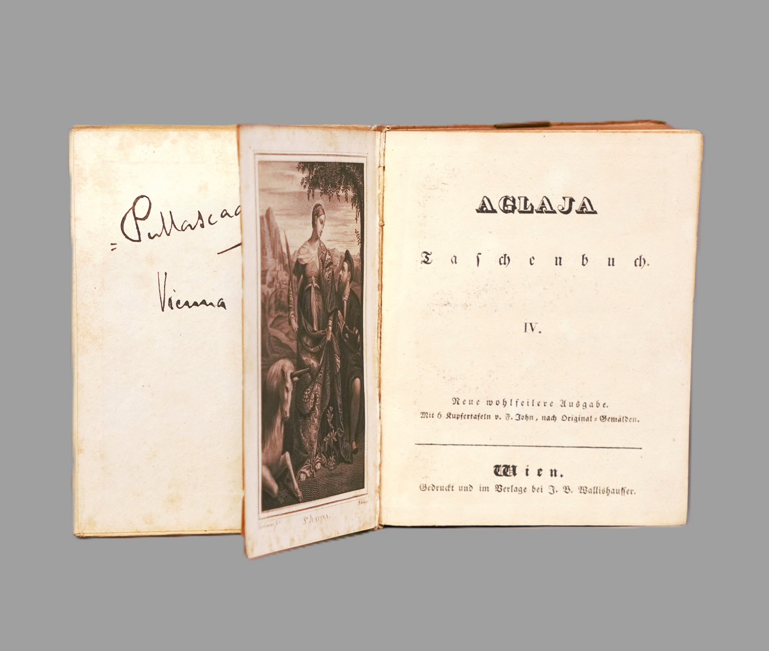 "P. Mascagni. Vienna 1901 - Maggio". Auf dem Innendeckel des Taschenbuchs: Aglaja. IV. (Hrsg. von J. Schreyvogel). Neue wohlfeilere Ausgabe. 290 S. Mit 6 Kupfertafeln von F. John. Kl. 8vo. Illustr. OPpbd mit Goldschnitt. Wien, Wallishausser, (1826 ?). - Vgl. Köhring S. 6. Aus welchem Anlaß sich der Komponist in Wien in den hübschen Almanach eingeschrieben hat, ob als Autogramm oder als Besitzvermerk, ist nicht bekannt. - Gebräuntes Papier; sonst ordentlich erhalten.