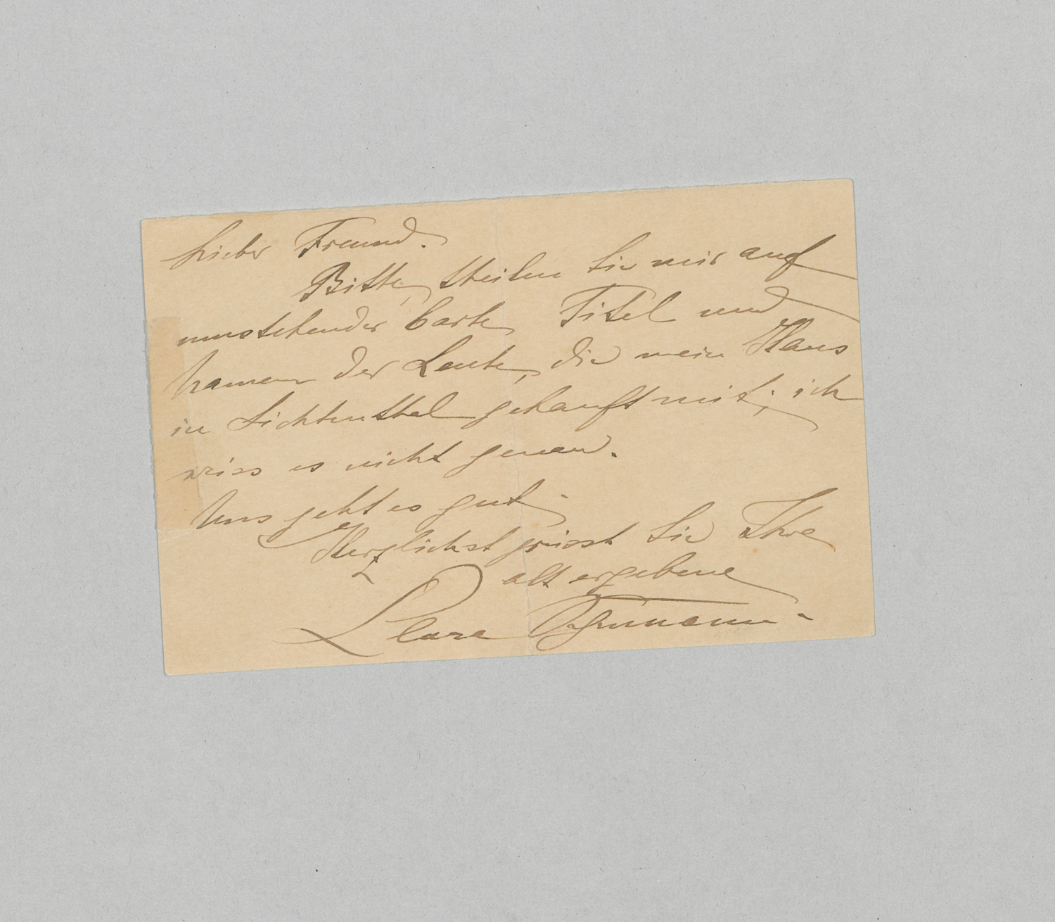 An den Komponisten Jacob Rosenhain in Baden-Baden. "... Bitte schreiben Sie mir auf umstehender Carte Titel und Namen der Leute, die mein Haus in Lichtenthal gekauft mit; ich weiss es nicht genau. - Uns geht es gut ...". - Clara Schumanns altes Haus befand sich in der Lichtenthaler Straße Nr. 14. In derselben Straße Nr. 8, also beinahe als Nachbar, wohnte Johannes Brahms. - Mit vertikaler Falte und repariertem kleinen Randdefekt.