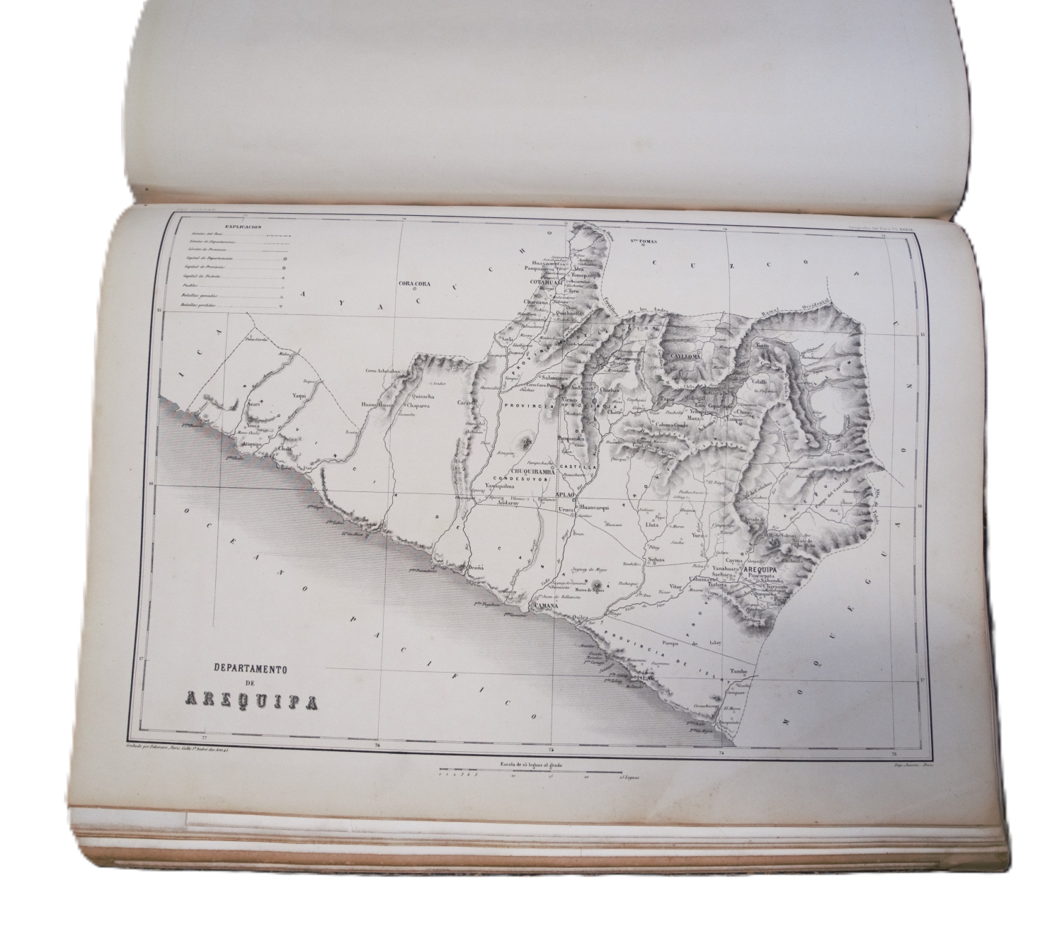 Phillips I, 2769 (73 Tafeln). Palau VI, 54 (68 Tafeln). Sabin I, 59325 (67 Tafeln). – Ein Atlas über Peru von dem peruanischen Historiker und Geograf Mariano Felipe Paz Soldan (1821-1886). Die zahlreichen Tafeln zeigen Ansichten des Landes, Landkarten, Stadtpläne und Alltagsszenen. – Zusätzlich Tafel XXIXbis vorhanden, diese nicht bei Phillips angegeben. Einige der Titel auf den Tafeln mit leichten Abweichungen zu den von Phillips angegebenen oder anderer Nummerierung. Vortitel stärker fleckig, mit Einrissen und Randläsuren. Papierbedingt gebräunt, etwas stock- und braunfleckig sowie mit Knickspuren.
