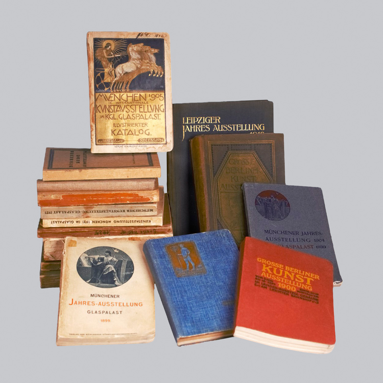 Enthält: Katalog Große Berliner Kunst-Ausstellung 1900. - Katalog der neunten Kunstausstellung der Berliner Secession. 2. Auflage. OHalbleinen. Berlin 1904. - Officieller Katalog der Großen Berliner Kunst-Ausstellung 1906. - Katalog der Großen Berliner Kunst-Ausstellung 1907. - Katalog der Großen Berliner Kunstausstellung 1912. 2 Bde. - Große Berliner Kunstausstellung 1925. - Offizieller Katalog der Münchener Jahres-Ausstellung 1899 im Kgl. Glaspalast. 3. Ausgabe. - Münchener Jahres-Ausstellung 1904 im Kgl. Glaspalast. - Offizieller Katalog der IX. Internationalen Kunstausstellung im Kgl. Glaspalast zu München 1905. 2. Auflage. - Offizieller Katalog der X. Internationalen Kunstausstellung im Kgl. Glaspalast zu München 1909. - Münchener Kunstausstellung 1923 im Glaspalast. - Münchener Kunstausstellung im Glaspalast 1925. Amtlicher Katalog. - Münchener Kunstausstellung 1931 im Glaspalast. 1931. - LIA. Leipziger Jahres-Austellung 1912 für Aquarell, Pastell, Zeichnung und Kleinplastik. II. Auflage. Leinenband mit goldgepr. Deckeltitel. 1912. - S. 3-50 (1 Lage) fehlen. - Offizieller Katalog der Deutschen Kunst-Ausstellung Dresden 1899. 3. Auflage. - Offizieller Katalog der Internationalen Kunstausstellung Dresden 1901. 2. Auflage. OLeinenband. – Einige Bände mit stärkeren Gebrauchsspuren, Annotationen, Kommentaren u. ä.