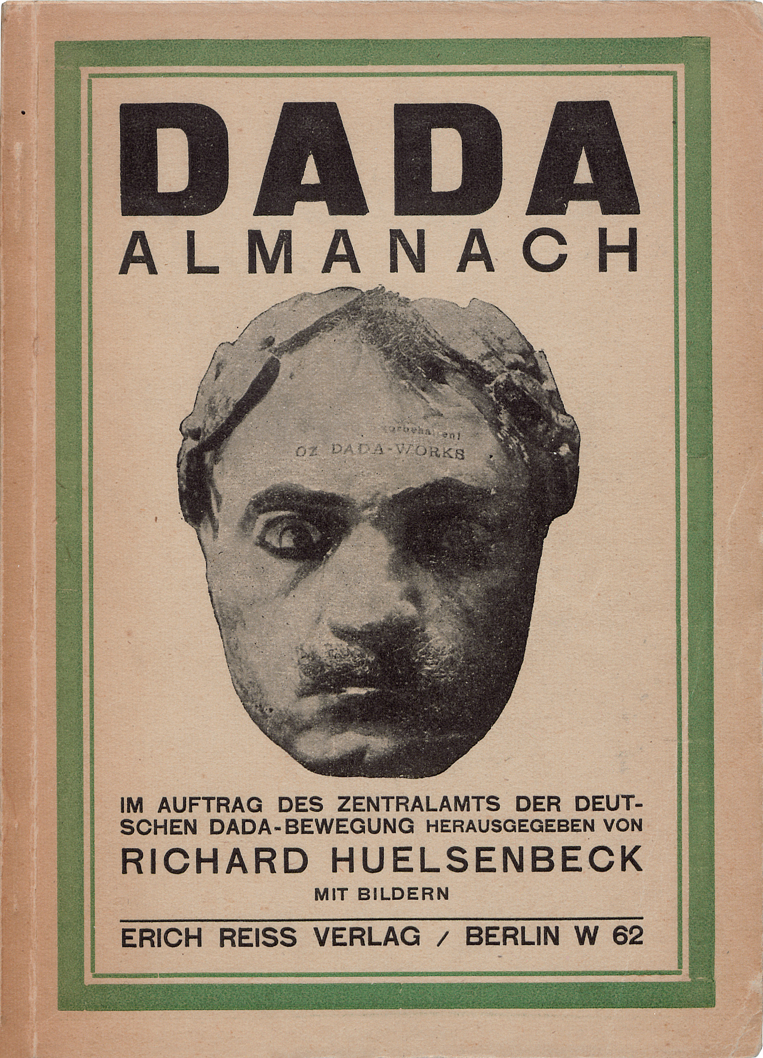 Dada. - Dada Almanach. Im Auftrag des Zentralamts der Deutschen Dada-Bewegung herausgegeben von Richard Huelsenbeck. 1 Bl., 159 S. Mit 8 Tafeln. 18 x 13,5 cm. Illustrierte OBroschur (etwas gebräunt). Berlin, Reiss, 1920.