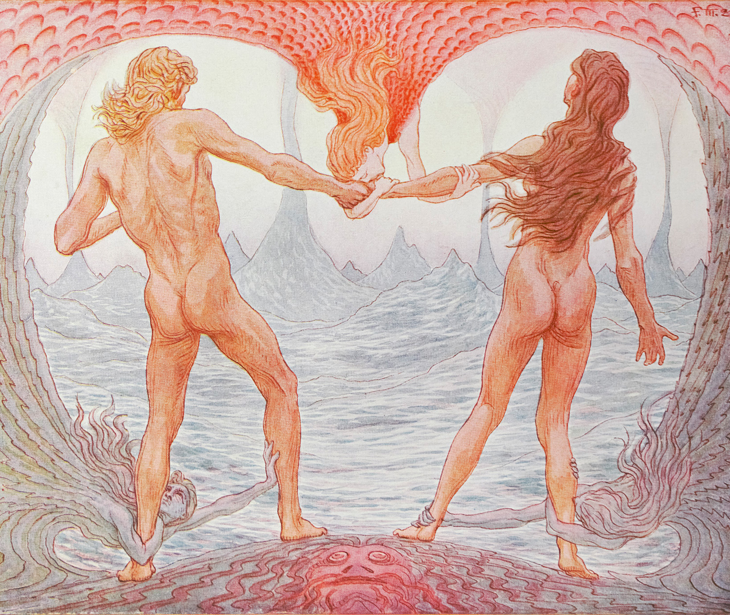 Fidus (d.i. Hugo Höppener). - Rentsch, Arno. Fiduswerk. Eine Einführung in das Leben und Wirken des Meisters Fidus. 183 S. Mit 6 Farbtafeln und 174 Textabb. 25,5 x 17,5 cm. Illustr. OLeinenband. Dresden, Verlag der Schönheit, 1925.