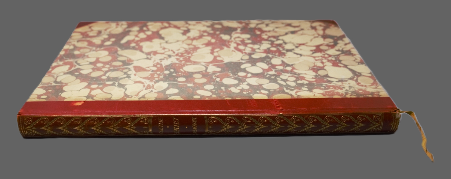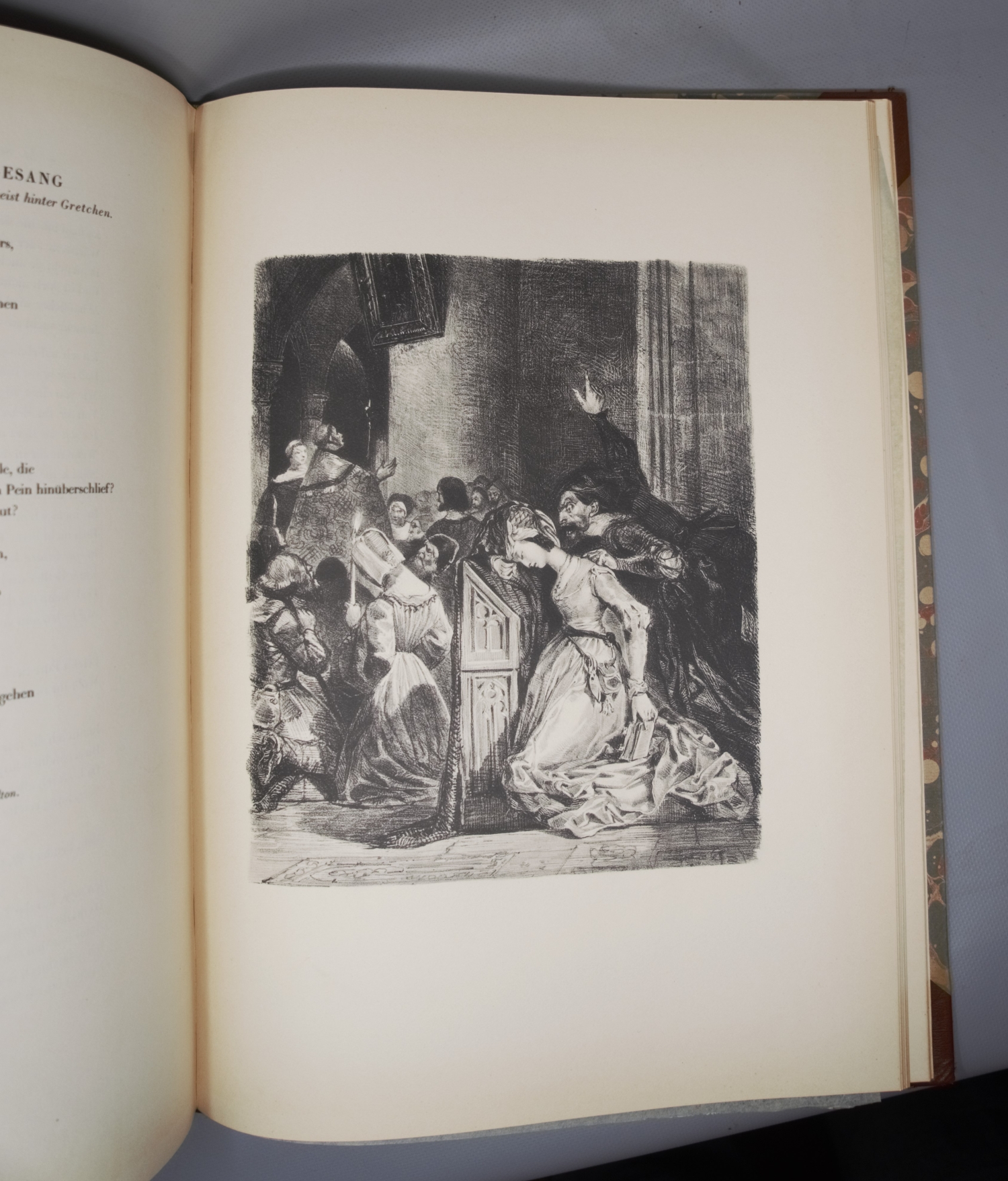 Goethe, (Johann Wolfgang von). Faust. Eine Tragödie. 2 Bl., 187 S., 1 Bl. Mit 17 Lichtdrucktafeln nach den Lithographien von Eugène Delacroix. 44,5 x 32 cm. Roter OHalblederband (etwas berieben, VDeckel mit kleinerer Schabspur; Entwurf: E. R. Weiß) mit reicher ornamentaler RVergoldung, goldgeprägtem RTitel und KGoldschnitt Leipzig, Insel, 1912.