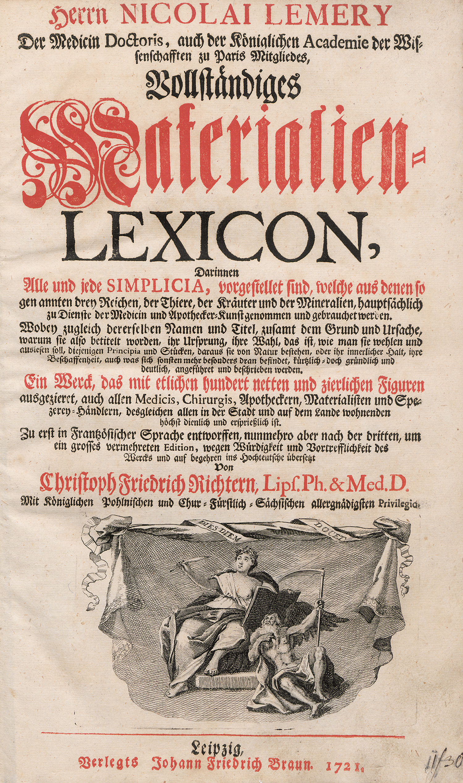 Lémery, Nicolai. Vollständiges Materialien-Lexicon ... ins Hochteutsche übersetzt Von Chr. Fr. Riechtern. 7 Bl., 1224 Sp., 19 Bl. Mit Titel in Rot und Schwarz und gestochener Titelvignette sowie zahlreichen Textholzschnitten. 35 x 21 cm. Pappband des 19. Jahrhunderts (Rücken unter Verwendung alten Materials fachmännisch erneuert, mit goldgeprägtem Rückenschild; Deckel mit Knickspuren, berieben und stärker beschabt). Leipzig, J. F. Braun, 1721.