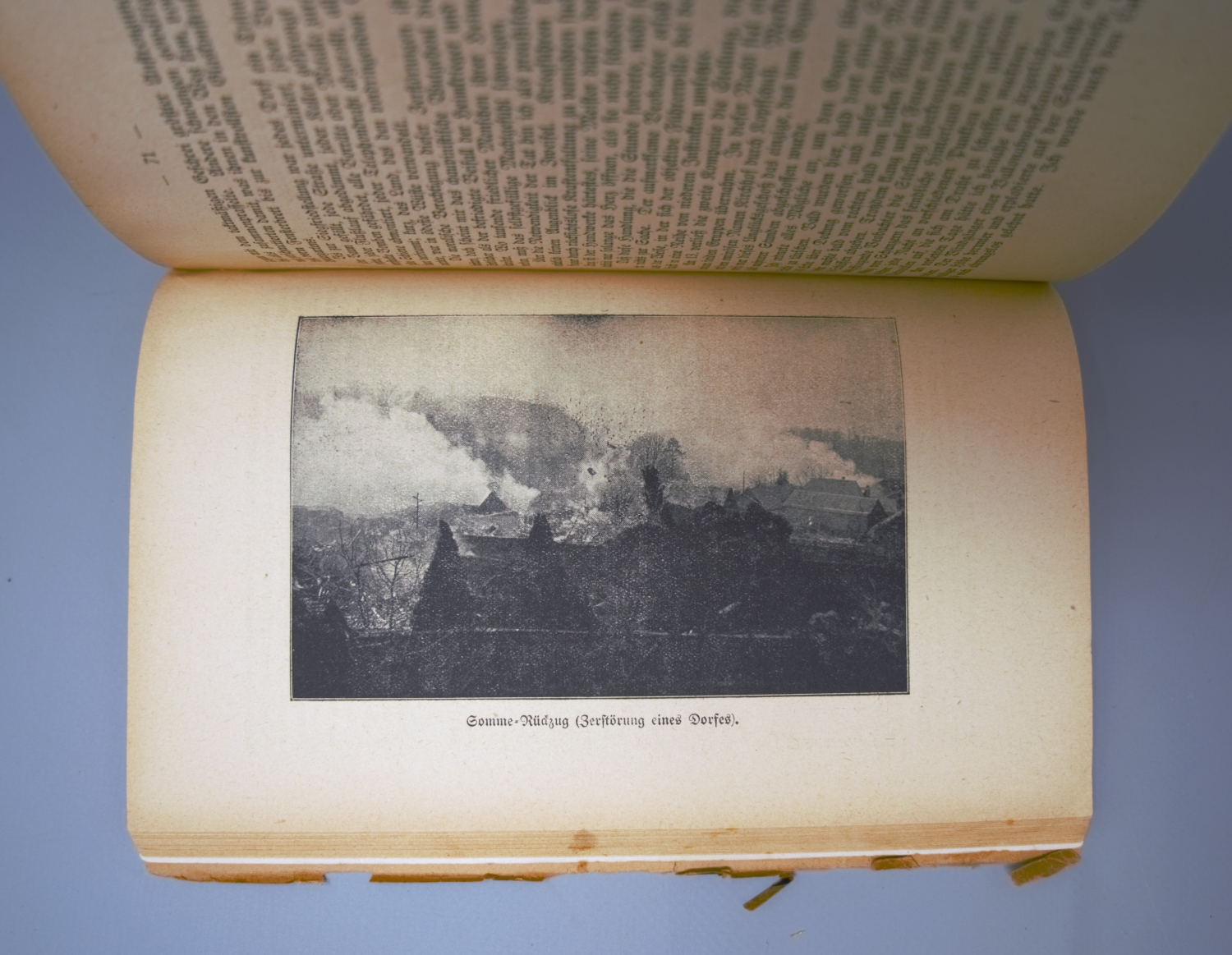 Des Coudres-Mühleisen B1a. – Erste Ausgabe der ersten selbständigen Veröffentlichung Jüngers. Exemplar der ursprünglichen Auflage, noch ohne das durch den Verlag von Robert Meier überklebte bzw. überstempelte Impressum. Hier in der Einbandvariante: "Auf beigefarbenem Grund Titelschild u. Randleiste in Ocker mit stilisierter Darstellung von 15 krepierenden Schrapnells. Autorname u. Titel in Schwarz. Ein blaues Band, von der Mitte des unteren Buchrandes bis zum unteren Drittel des rechten Buchrandes laufend, trägt die silberne Inschrift GIBRALTAR" (des Coudres). – Anfangs oben wasserrandig.