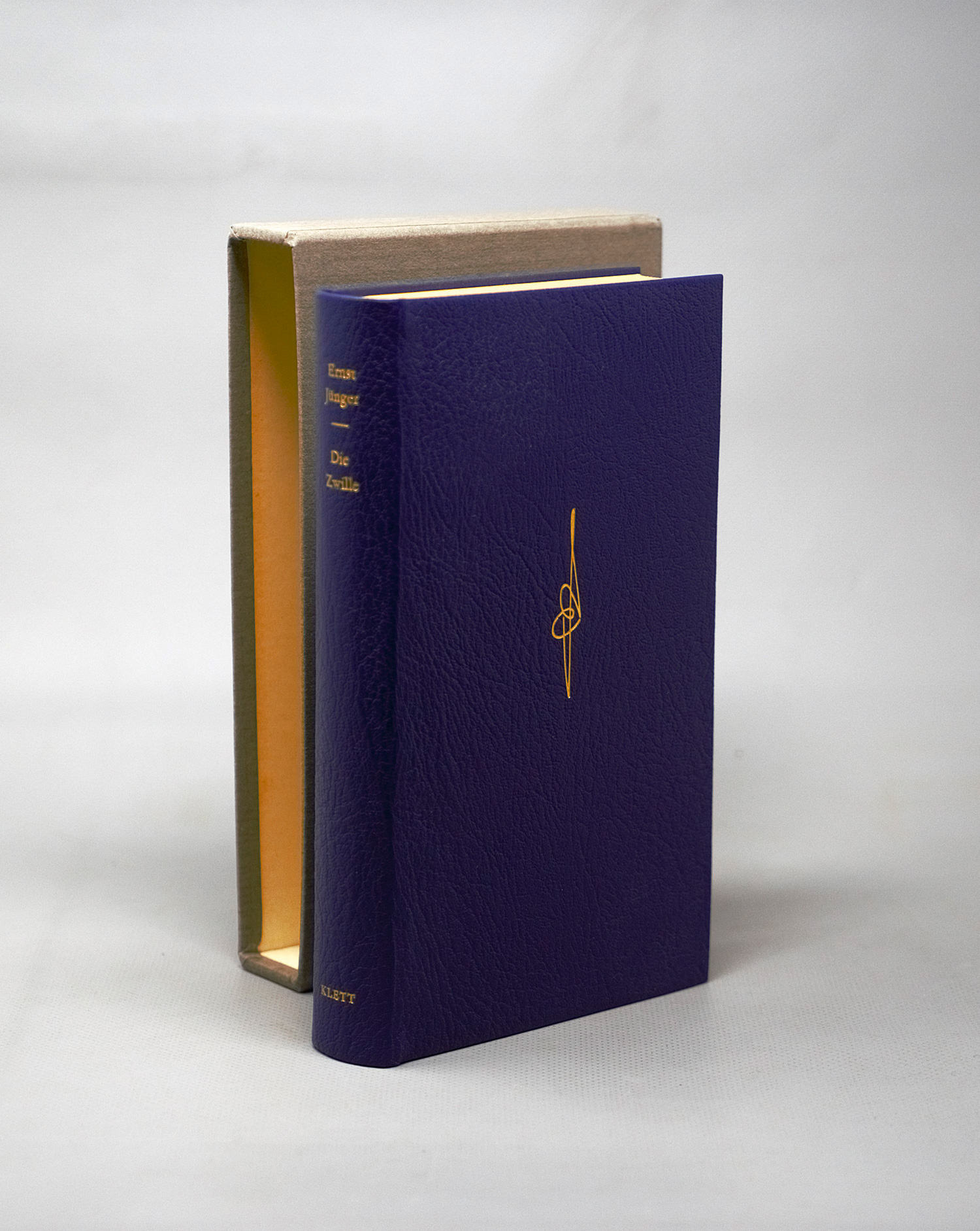 Jünger, Ernst. Die Zwille. 329 S., 1 Bl. 21,5 x 13,5 cm. Blauer Orig.-Maroquinband mit goldgepr. Deckelsignet und RTitel. Im OPappschuber. Stuttgart, E. Klett, 1973.