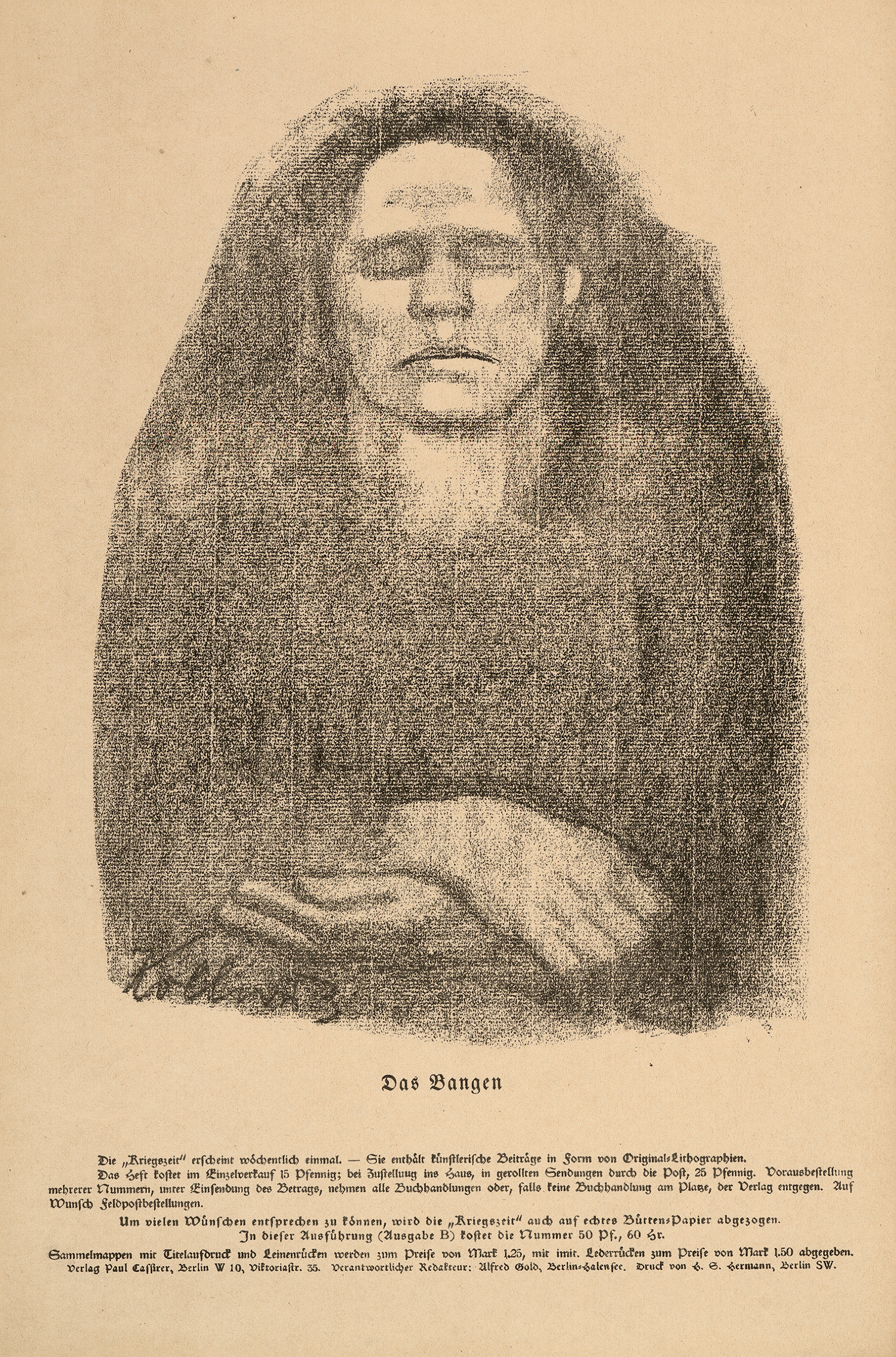 Söhn I, 134. Feilchenfeldt-Brandis Z3. Jentsch 23. – Umfangreiche Folge, hier mit dem häufig fehlenden Sonderheft von Max Oppenheimer, mit zahlreichen Original-Lithographien von Max Liebermann, Ernst Barlach, Max Beckmann, August Gaul, Max Oppenheimer, Otto Hettner u. a. Am Schluss eingebunden sind die im Format etwas kleineren, von Bruno Goldschmitt illustrierten "Münchner Kriegsblätter" (Folge I und II) sowie "Richard Dehmel, Vier Kriegslieder", (zugleich 1. bis 3. Kriegsflugblatt der Zeitschrift "Der Zwiebelfisch"). Die "Kriegszeit" wurde bis Ende März 1916 fortgeführt und dann vom Verlag eingestellt. – Anfangs papierbedingt stärker bis stark gebräunt, zwei Bl. mit Einrissen. Die Nummer 21 bis 49 auf besserem Papier.